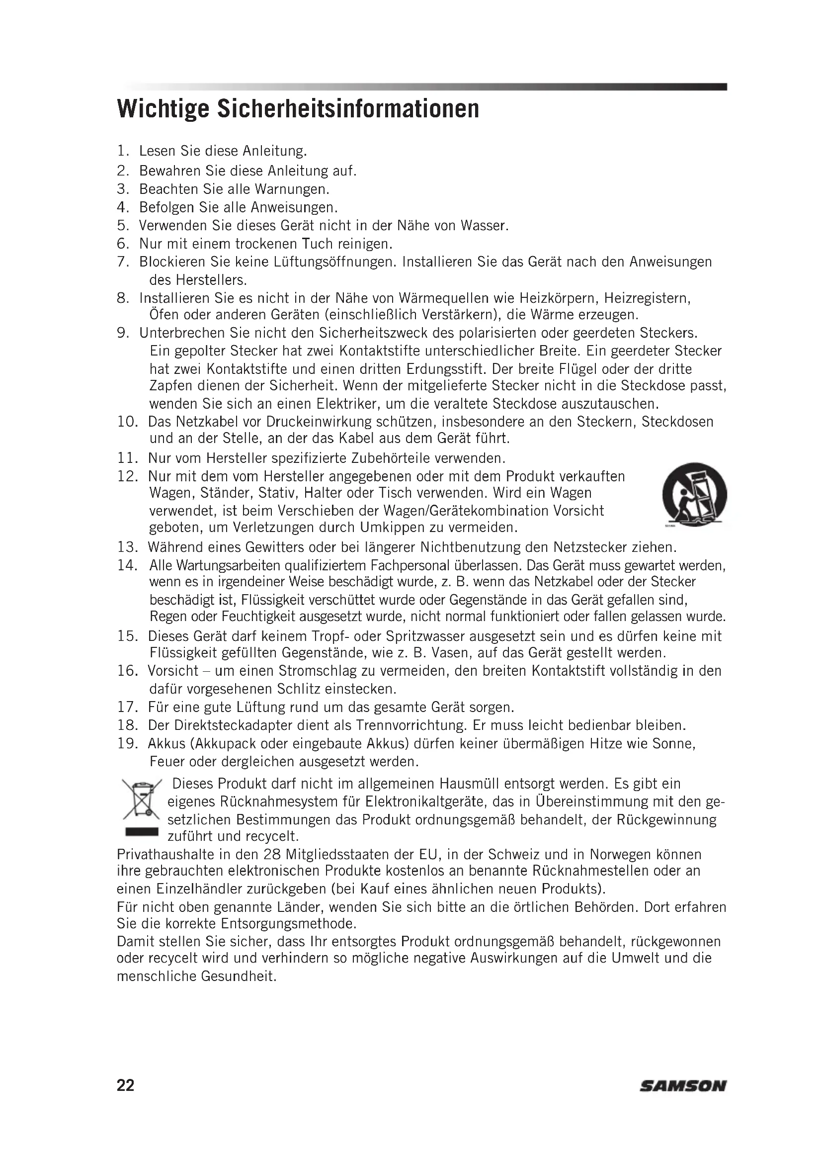 - Nicht für den Einsatz in den USA und Kanada geeignet. Für Fragen zu den verfügbaren Kanälen in Ihrer Nähe wenden Sie sich bitte an Ihren lokalen Samson-Händler.32 Información de seguridad importante