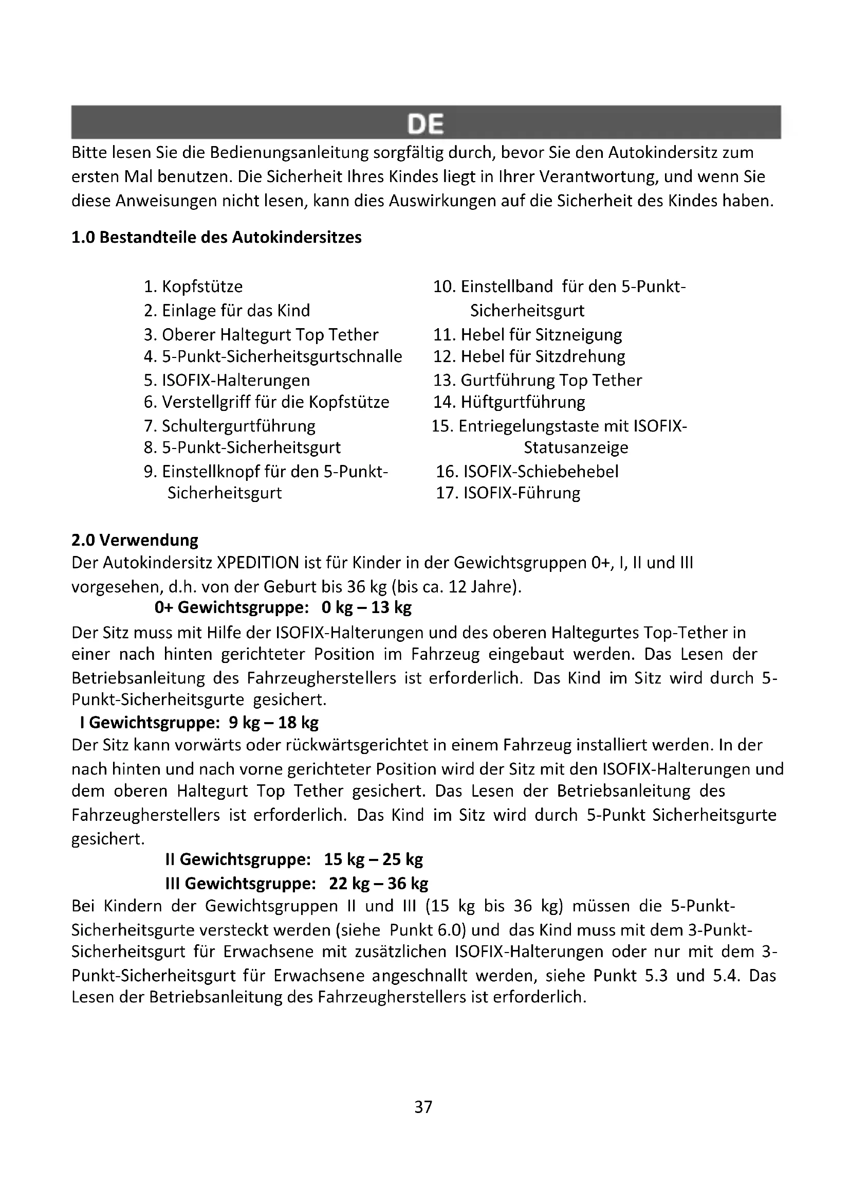 Der Autokindersitz XPEDITION ist für Kinder in der Gewichtsgruppen 0+, I, II und III vorgesehen, d.h. von der Geburt bis 36 kg (bis ca. 12 Jahre). 0+ Gewichtsgruppe: 0 kg – 13 kg Der Sitz muss mit Hilfe der ISOFIX-Halterungen und des oberen Haltegurtes Top-Tether in einer nach hinten gerichteter Position im Fahrzeug eingebaut werden. Das Lesen der Betriebsanleitung des Fahrzeugherstellers ist erforderlich. Das Kind im Sitz wird durch 5- Punkt-Sicherheitsgurte gesichert. I Gewichtsgruppe: 9 kg – 18 kg Der Sitz kann vorwärts oder rückwärtsgerichtet in einem Fahrzeug installiert werden. In der nach hinten und nach vorne gerichteter Position wird der Sitz mit den ISOFIX-Halterungen und dem oberen Haltegurt Top Tether gesichert. Das Lesen der Betriebsanleitung des Fahrzeugherstellers ist erforderlich. Das Kind im Sitz wird durch 5-Punkt Sicherheitsgurte gesichert. II Gewichtsgruppe: 15 kg – 25 kg III Gewichtsgruppe: 22 kg – 36 kg Bei Kindern der Gewichtsgruppen II und III (15 kg bis 36 kg) müssen die 5-Punkt- Sicherheitsgurte versteckt werden (siehe Punkt 6.0) und das Kind muss mit dem 3-Punkt- Sicherheitsgurt für Erwachsene mit zusätzlichen ISOFIX-Halterungen oder nur mit dem 3- Punkt-Sicherheitsgurt für Erwachsene angeschnallt werden, siehe Punkt 5.3 und 5.4. Das Lesen der Betriebsanleitung des Fahrzeugherstellers ist erforderlich.38