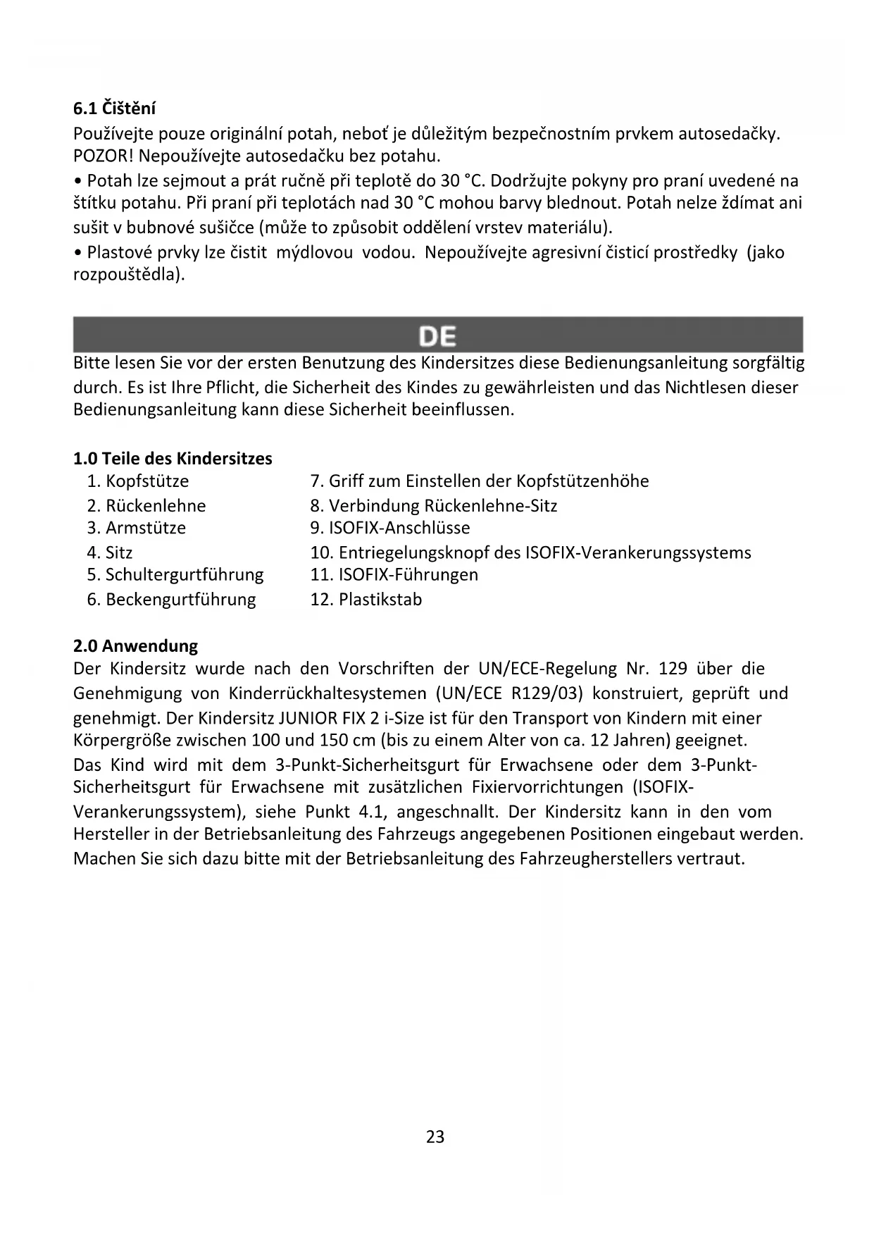 Der Kindersitz wurde nach den Vorschriften der UN/ECE-Regelung Nr. 129 über die Genehmigung von Kinderrückhaltesystemen (UN/ECE R129/03) konstruiert, geprüft und genehmigt. Der Kindersitz JUNIOR FIX 2 i-Size ist für den Transport von Kindern mit einer Körpergröße zwischen 100 und 150 cm (bis zu einem Alter von ca. 12 Jahren) geeignet. Das Kind wird mit dem 3-Punkt-Sicherheitsgurt für Erwachsene oder dem 3-Punkt- Sicherheitsgurt für Erwachsene mit zusätzlichen Fixiervorrichtungen (ISOFIX- Verankerungssystem), siehe Punkt 4.1, angeschnallt. Der Kindersitz kann in den vom Hersteller in der Betriebsanleitung des Fahrzeugs angegebenen Positionen eingebaut werden. Machen Sie sich dazu bitte mit der Betriebsanleitung des Fahrzeugherstellers vertraut.24