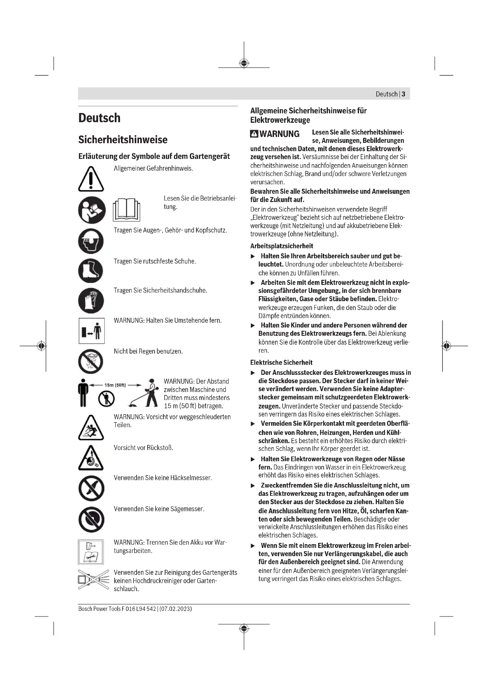 F 016 L94 542 | (07.02.2023) Bosch Power ToolsDeutsch | 3 Deutsch Sicherheitshinweise Erläuterung der Symbole auf dem Gartengerät Allgemeiner Gefahrenhinweis. Lesen Sie die Betriebsanlei- tung. Tragen Sie Augen-, Gehör- und Kopfschutz. Tragen Sie rutschfeste Schuhe. Tragen Sie Sicherheitshandschuhe. WARNUNG: Halten Sie Umstehende fern. Nicht bei Regen benutzen. WARNUNG: Der Abstand zwischen Maschine und Dritten muss mindestens 15 m (50 ft) betragen. WARNUNG: Vorsicht vor weggeschleuderten Teilen. Vorsicht vor Ruckstoß. Verwenden Sie keine Häckselmesser. Verwenden Sie keine Sägemesser. WARNUNG: Trennen Sie den Akku vor War- tungsarbeiten. Verwenden Sie zur Reinigung des Gartengeräts keinen Hochdruckreiniger oder Garten- schlauch. Allgemeine Sicherheitshinweise für Elektrowerkzeuge WARNUNG Lesen Sie alle Sicherheitshinwei- se, Anweisungen, Bebilderungen und technischen Daten, mit denen dieses Elektrowerk- zeug versehen ist. Versäumnisse bei der Einhaltung der Si- cherheitshinweise und nachfolgenden Anweisungen können elektrischen Schlag, Brand und/oder schwere Verletzungen verursachen. Bewahren Sie alle Sicherheitshinweise und Anweisungen für die Zukunft auf. Der in den Sicherheitshinweisen verwendete Begriff „Elektrowerkzeug“ bezieht sich auf netzbetriebene Elektro- werkzeuge (mit Netzleitung) und auf akkubetriebene Elek- trowerkzeuge (ohne Netzleitung). Arbeitsplatzsicherheit u Halten Sie Ihren Arbeitsbereich sauber und gut be- leuchtet. Unordnung oder unbeleuchtete Arbeitsberei- che können zu Unfällen führen. u Arbeiten Sie mit dem Elektrowerkzeug nicht in explo- sionsgefährdeter Umgebung, in der sich brennbare Flüssigkeiten, Gase oder Stäube befinden. Elektro- werkzeuge erzeugen Funken, die den Staub oder die Dämpfe entzünden können. u Halten Sie Kinder und andere Personen während der Benutzung des Elektrowerkzeugs fern. Bei Ablenkung können Sie die Kontrolle über das Elektrowerkzeug verlie- ren. Elektrische Sicherheit u Der Anschlussstecker des Elektrowerkzeuges muss in die Steckdose passen. Der Stecker darf in keiner Wei- se verändert werden. Verwenden Sie keine Adapter- stecker gemeinsam mit schutzgeerdeten Elektrowerk- zeugen. Unveränderte Stecker und passende Steckdo- sen verringern das Risiko eines elektrischen Schlages. u Vermeiden Sie Körperkontakt mit geerdeten Oberflä- chen wie von Rohren, Heizungen, Herden und Kühl- schränken. Es besteht ein erhöhtes Risiko durch elektri- schen Schlag, wenn Ihr Körper geerdet ist. u Halten Sie Elektrowerkzeuge von Regen oder Nässe fern. Das Eindringen von Wasser in ein Elektrowerkzeug erhöht das Risiko eines elektrischen Schlages. u Zweckentfremden Sie die Anschlussleitung nicht, um das Elektrowerkzeug zu tragen, aufzuhängen oder um den Stecker aus der Steckdose zu ziehen. Halten Sie die Anschlussleitung fern von Hitze, Öl, scharfen Kan- ten oder sich bewegenden Teilen. Beschädigte oder verwickelte Anschlussleitungen erhöhen das Risiko eines elektrischen Schlages. u Wenn Sie mit einem Elektrowerkzeug im Freien arbei- ten, verwenden Sie nur Verlängerungskabel, die auch für den Außenbereich geeignet sind. Die Anwendung einer für den Außenbereich geeigneten Verlängerungslei- tung verringert das Risiko eines elektrischen Schlages. Bosch Power Tools F 016 L94 542 | (07.02.2023)4 | Deutsch u Wenn der Betrieb des Elektrowerkzeuges in feuchter Umgebung nicht vermeidbar ist, verwenden Sie einen Fehlerstromschutzschalter. Der Einsatz eines Fehler- stromschutzschalters vermindert das Risiko eines elektri- schen Schlages. Sicherheit von Personen u Seien Sie aufmerksam, achten Sie darauf, was Sie tun, und gehen Sie mit Vernunft an die Arbeit mit einem Elektrowerkzeug. Benutzen Sie kein Elektrowerkzeug, wenn Sie müde sind oder unter dem Einfluss von Dro- gen, Alkohol oder Medikamenten stehen. Ein Moment der Unachtsamkeit beim Gebrauch des Elektrowerkzeu- ges kann zu ernsthaften Verletzungen führen. u Tragen Sie persönliche Schutzausrüstung und immer eine Schutzbrille. Das Tragen persönlicher Schutzaus- rüstung, wie Staubmaske, rutschfeste Sicherheitsschuhe, Schutzhelm oder Gehörschutz, je nach Art und Einsatz des Elektrowerkzeuges, verringert das Risiko von Verlet- zungen. u Vermeiden Sie eine unbeabsichtigte Inbetriebnahme. Vergewissern Sie sich, dass das Elektrowerkzeug aus- geschaltet ist, bevor Sie es an die Stromversorgung und/oder den Akku anschließen, es aufnehmen oder tragen. Wenn Sie beim Tragen des Elektrowerkzeuges den Finger am Schalter haben oder das Gerät eingeschal- tet an die Stromversorgung anschließen, kann dies zu Un- fällen führen. u Entfernen Sie Einstellwerkzeuge oder Schrauben- schlüssel, bevor Sie das Elektrowerkzeug einschalten. Ein Werkzeug oder Schlüssel, der sich in einem drehen- den Geräteteil befindet, kann zu Verletzungen führen. u Vermeiden Sie eine abnormale Körperhaltung. Sorgen Sie für einen sicheren Stand und halten Sie jederzeit das Gleichgewicht. Dadurch können Sie das Elektro- werkzeug in unerwarteten Situationen besser kontrollie- ren. u Tragen Sie geeignete Kleidung. Tragen Sie keine weite Kleidung oder Schmuck. Halten Sie Haare und Klei- dung fern von sich bewegenden Teilen. Lockere Klei- dung, Schmuck oder lange Haare können von sich bewe- genden Teilen erfasst werden. u Wenn Staubabsaug- und -auffangeinrichtungen mon- tiert werden können, sind diese anzuschließen und richtig zu verwenden. Verwendung einer Staubabsau- gung kann Gefährdungen durch Staub verringern. u Wiegen Sie sich nicht in falscher Sicherheit und set- zen Sie sich nicht über die Sicherheitsregeln für Elek- trowerkzeuge hinweg, auch wenn Sie nach vielfachem Gebrauch mit dem Elektrowerkzeug vertraut sind. Achtloses Handeln kann binnen Sekundenbruchteilen zu schweren Verletzungen führen. Verwendung und Behandlung des Elektrowerkzeugs u Überlasten Sie das Elektrowerkzeug nicht. Verwenden Sie für Ihre Arbeit das dafür bestimmte Elektrowerk- zeug. Mit dem passenden Elektrowerk