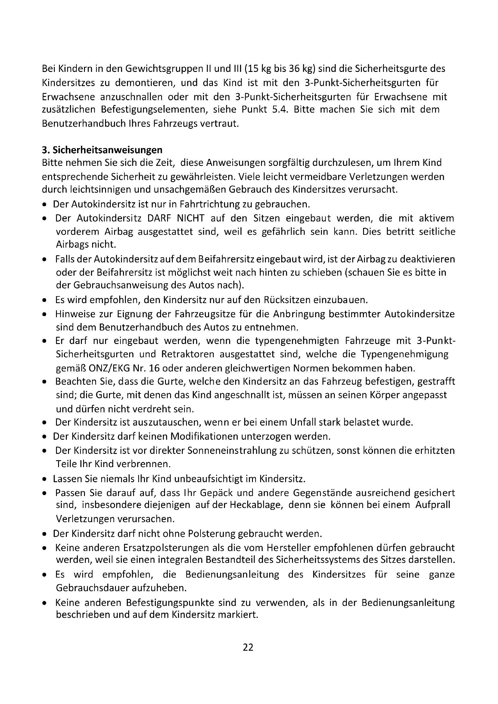 Der Autokindersitz ist für Kinder der Gewichtsgruppen von I bis III bestimmt, also mit einem Körpergewicht von 9 kg bis 36 kg (von ca. 9 Monaten bis 11. Lebensjahr). Gewichtsgruppe I: 9 kg – 18 kg Mit dem ISOFIX-Befestigungssystem und oberen Befestigungsgurt. Bitte machen Sie sich mit dem Benutzerhandbuch Ihres Fahrzeugs vertraut. Die Sicherheitsgurte des Kindersitzes (Begurtung) sind nur für die Verwendung bei Kindern in der Gewichtsgruppe I vorgesehen. Gewichtgruppe II: 15 kg – 25 kg Gewichtgruppe III: 22 kg – 36 kg22 Bei Kindern in den Gewichtsgruppen II und III (15 kg bis 36 kg) sind die Sicherheitsgurte des Kindersitzes zu demontieren, und das Kind ist mit den 3-Punkt-Sicherheitsgurten für Erwachsene anzuschnallen oder mit den 3-Punkt-Sicherheitsgurten für Erwachsene mit zusätzlichen Befestigungselementen, siehe Punkt 5.4. Bitte machen Sie sich mit dem Benutzerhandbuch Ihres Fahrzeugs vertraut.