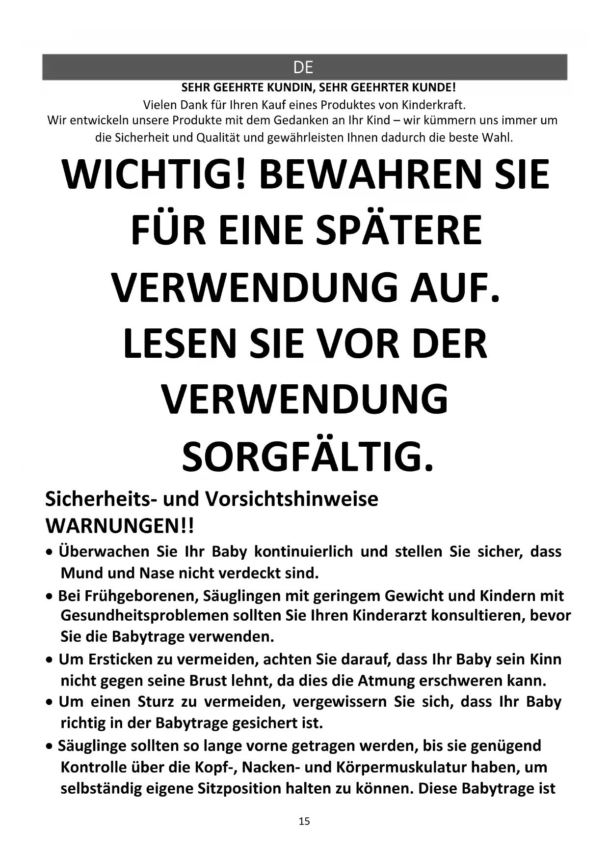 - Säuglinge sollten so lange vorne getragen werden, bis sie genügend Kontrolle über die Kopf-, Nacken- und Körpermuskulatur haben, um selbständig eigene Sitzposition halten zu können. Diese Babytrage ist16 nicht für die Verwendung in der Position „Vorwärts in die Welt“ vorgesehen.