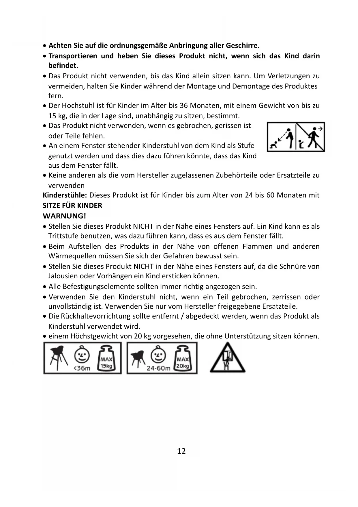 - Keine anderen als die vom Hersteller zugelassenen Zubehörteile oder Ersatzteile zu verwenden Kinderstühle: Dieses Produkt ist für Kinder bis zum Alter von 24 bis 60 Monaten mit