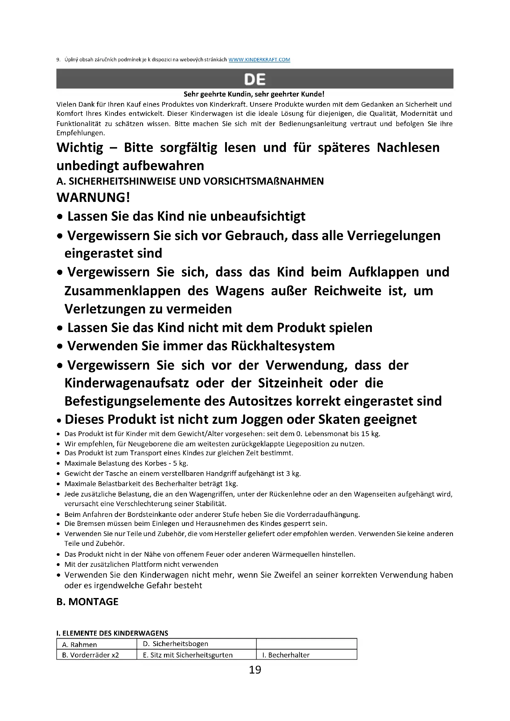 Sehr geehrte Kundin, sehr geehrter Kunde! Vielen Dank für Ihren Kauf eines Produktes von Kinderkraft. Unsere Produkte wurden mit dem Gedanken an Sicherheit und Komfort Ihres Kindes entwickelt. Dieser Kinderwagen ist die ideale Lösung für diejenigen, die Qualität, Modernität und Funktionalität zu schätzen wissen. Bitte machen Sie sich mit der Bedienungsanleitung vertraut und befolgen Sie ihre Empfehlungen. Wichtig – Bitte sorgfältig lesen und für späteres Nachlesen unbedingt aufbewahren A. SICHERHEITSHINWEISE UND VORSICHTSMAßNAHMEN WARNUNG!