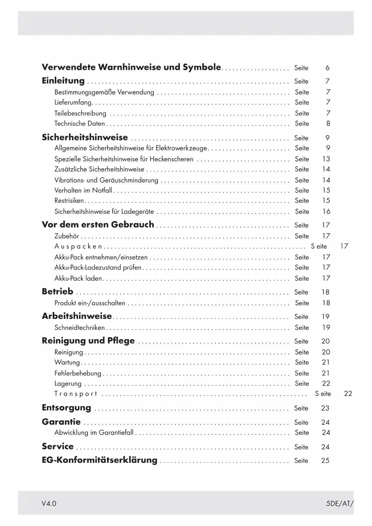 0–10º20V max. 18V5DE/AT/CH Verwendete Warnhinweise und Symbole................... Seite 6 Einleitung ........................................................ Seite 7 Bestimmungsgemäße Verwendung ..................................... Seite 7 Lieferumfang....................................................... Seite 7 Teilebeschreibung .................................................. Seite 7 Technische Daten ................................................... Seite 8 Sicherheitshinweise ............................................ Seite 9 Allgemeine Sicherheitshinweise für Elektrowerkzeuge....................... Seite 9 Spezielle Sicherheitshinweise für Heckenscheren .......................... Seite 13 Zusätzliche Sicherheitshinweise ........................................ Seite 14 Vibrations- und Geräuschminderung .................................... Seite 14 Verhalten im Notfall ................................................. Seite 15 Restrisiken......................................................... Seite 15 Sicherheitshinweise für Ladegeräte ..................................... Seite 16 Vor dem ersten Gebrauch ..................................... Seite 17 Zubehör .......................................................... Seite 17 Auspacken........................................................ Seite 17 Akku-Pack entnehmen/einsetzen ....................................... Seite 17 Akku-Pack-Ladezustand prüfen......................................... Seite 17 Akku-Pack laden.................................................... Seite 17 Betrieb ........................................................... Seite 18 Produkt ein-/ausschalten ............................................. Seite 18 Arbeitshinweise................................................. Seite 19 Schneidtechniken ................................................... Seite 19 Reinigung und Pflege .......................................... Seite 20 Reinigung ......................................................... Seite 20 Wartung.......................................................... Seite 21 Fehlerbehebung .................................................... Seite 21 Lagerung ......................................................... Seite 22 Transport ......................................................... Seite 22 Entsorgung ...................................................... Seite 23 Garantie ......................................................... Seite 24 Abwicklung im Garantiefall ........................................... Seite 24 Service ........................................................... Seite 24 EG-Konformitätserklärung .................................... Seite 25 V 4.06 DE/AT/CH Verwendete Warnhinweise und Symbole In dieser Bedienungsanleitung und auf der Verpackung werden die folgenden Warnhinweise verwendet: Lesen Sie die Bedienungsanleitung. Schutzhandschuhe tragen! GEFAHR! Dieses Symbol mit dem Signalwort „Gefahr“ bezeichnet eine Gefährdung mit einem hohen Risikograd, die, wenn sie nicht vermieden wird, eine schwere Verletzung oder den Tod zur Folge hat. Stromschlaggefahr Schalten Sie das Produkt aus und entnehmen Sie den Akku-Pack vor dem Auswechseln von Zubehör, Reinigung und bei Nichtgebrauch. WARNUNG! Dieses Symbol mit dem Signalwort „Warnung“ bezeichnet eine Gefährdung mit einem mittleren Risikograd, die, wenn sie nicht vermieden wird, eine schwere Verletzung oder den Tod zur Folge haben kann. Nicht dem Regen aussetzen! max. 45°C Schützen Sie den Akku-Pack vor Hitze und dauerhafter, starker Sonneneinstrahlung. Schützen Sie den Akku-Pack vor Wasser und Feuchtigkeit. VORSICHT! Dieses Symbol mit dem Signalwort „Vorsicht“ bezeichnet eine Gefährdung mit einem niedrigen Risikograd, die, wenn sie nicht vermieden wird, eine geringe oder mäßige Verletzung zur Folge haben kann. Schützen Sie den Akku-Pack vor Feuer. Schutzklasse II (Doppelisolierung) Wechselstrom/-spannung ACHTUNG! Dieses Symbol mit dem Signalwort „Achtung“ zeigt die Gefahr einer möglichen Sachbeschädigung an. Gleichstrom/-spannung Gefahr–Halten Sie die Hände vom Messer fern. Gehörschutz tragen! T3.15A Sicherung Schutzbrille tragen! Verwenden Sie das Produkt nur in trockenen Innenräumen. Rutschfestes, schützendes Schuhwerk tragen! Das CE-Zeichen bestätigt Konformität mit den für das Produkt zutreffenden EU-Richtlinien.7DE/AT/CH AKKU-HECKENSCHERE 20V PHSA 20-Li B2 z Einleitung Wir beglückwünschen Sie zum Kauf Ihres neuen Produkts. Sie haben sich damit für ein hochwertiges Produkt entschieden. Die Bedienungsanleitung ist Teil dieses Produkts. Sie enthält wichtige Hinweise für Sicherheit, Gebrauch und Entsorgung. Machen Sie sich vor der Benutzung des Produkts mit allen Bedien- und Sicherheitshinweisen vertraut. Benutzen Sie das Produkt nur wie beschrieben und für die angegebenen Einsatzbereiche. Händigen Sie alle Unterlagen bei Weitergabe des Produkts an Dritte mit aus. z Bestimmungsgemäße Verwendung Diese Akku-Heckenschere (im Folgenden „Produkt“ oder „Elektrowerkzeug“) ist zum Schneiden und Trimmen von Hecken, Büschen und Ziersträuchern bestimmt. Jede andere Verwendung oder Veränderung des Produkts gilt als nicht bestimmungsgemäß und kann zu Gefahren wie Tod, lebensbedrohlichen Verletzungen und Schäden führen. Der Hersteller haftet nicht für Schäden, die durch unsachgemäßen Gebrauch entstehen. Dieses Produkt ist für den heimischen Gebrauch und ähnliche Anwendungen bestimmt. Das Produkt ist nicht für den gewerblichen Einsatz geeignet. Das Produkt ist für den Gebrauch durch Erwachsene bestimmt. Jugendliche über 16 Jahren dürfen das Produkt nur unter Aufsicht verwenden. Der Betreiber oder Benutzer ist für Unfälle oder Schäden an anderen Personen oder deren Eigentum verantwortlich. Das Produkt ist Teil der Parkside X 20 V Team Serie. Das Produkt muss mit Akku-Packs aus der Parkside X 20 V Team Serie verwendet werden. z Lieferumfang