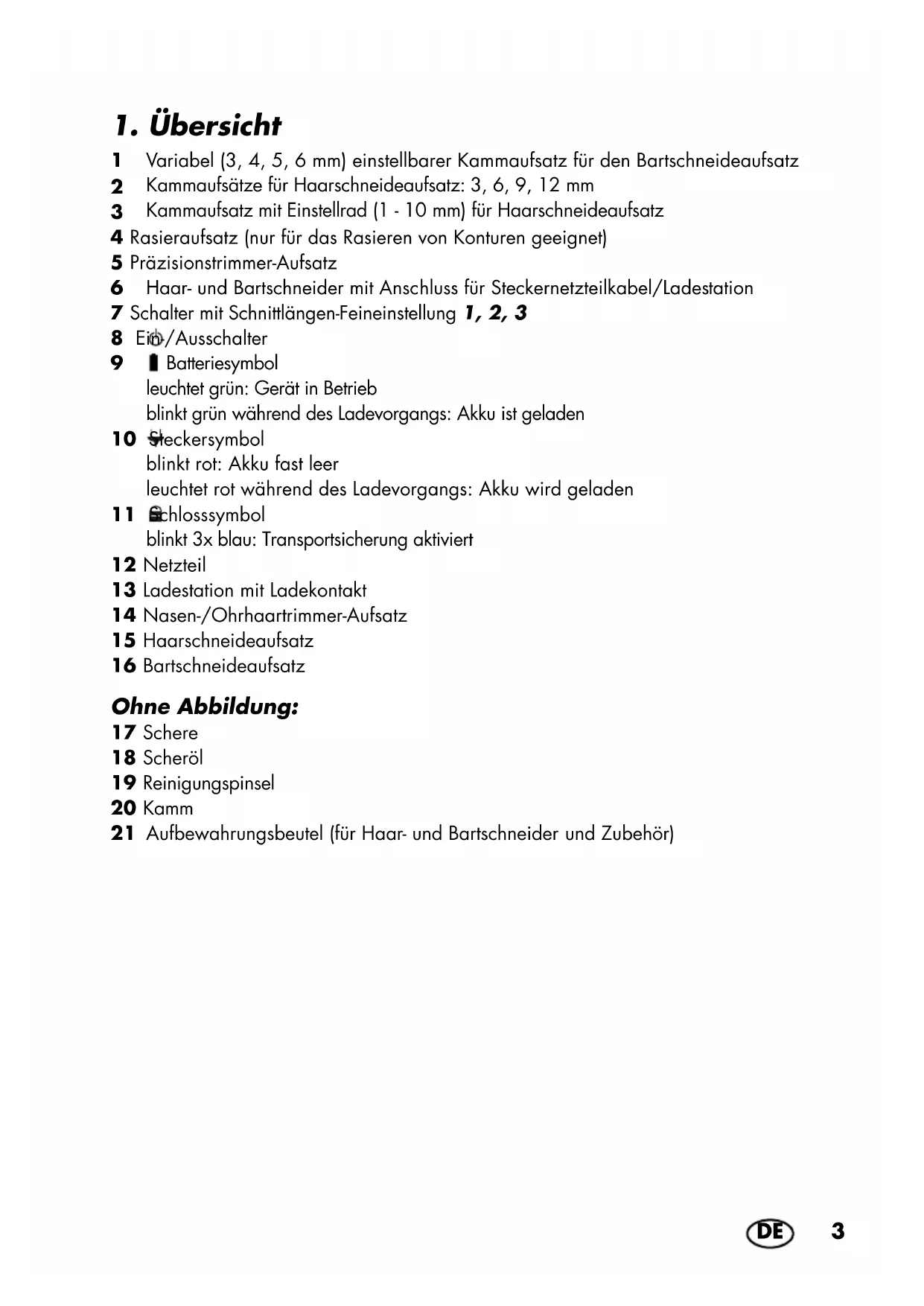 Batteriesymbol leuchtet grün: Gerät in Betrieb blinkt grün während des Ladevorgangs: Akku ist geladen 10 Steckersymbol blinkt rot: Akku fast leer leuchtet rot während des Ladevorgangs: Akku wird geladen 11 Schlosssymbol blinkt 3x blau: Transportsicherung aktiviert 12 Netzteil 13 Ladestation mit Ladekontakt 14 Nasen-/Ohrhaartrimmer-Aufsatz 15 Haarschneideaufsatz 16 Bartschneideaufsatz Ohne Abbildung: 17 Schere 18 Scheröl 19 Reinigungspinsel 20 Kamm 21 Aufbewahrungsbeutel (für Haar- und Bartschneider und Zubehör) __384419_2107_B8.book Seite 3 Mittwoch, 17. November 2021 11:35 114