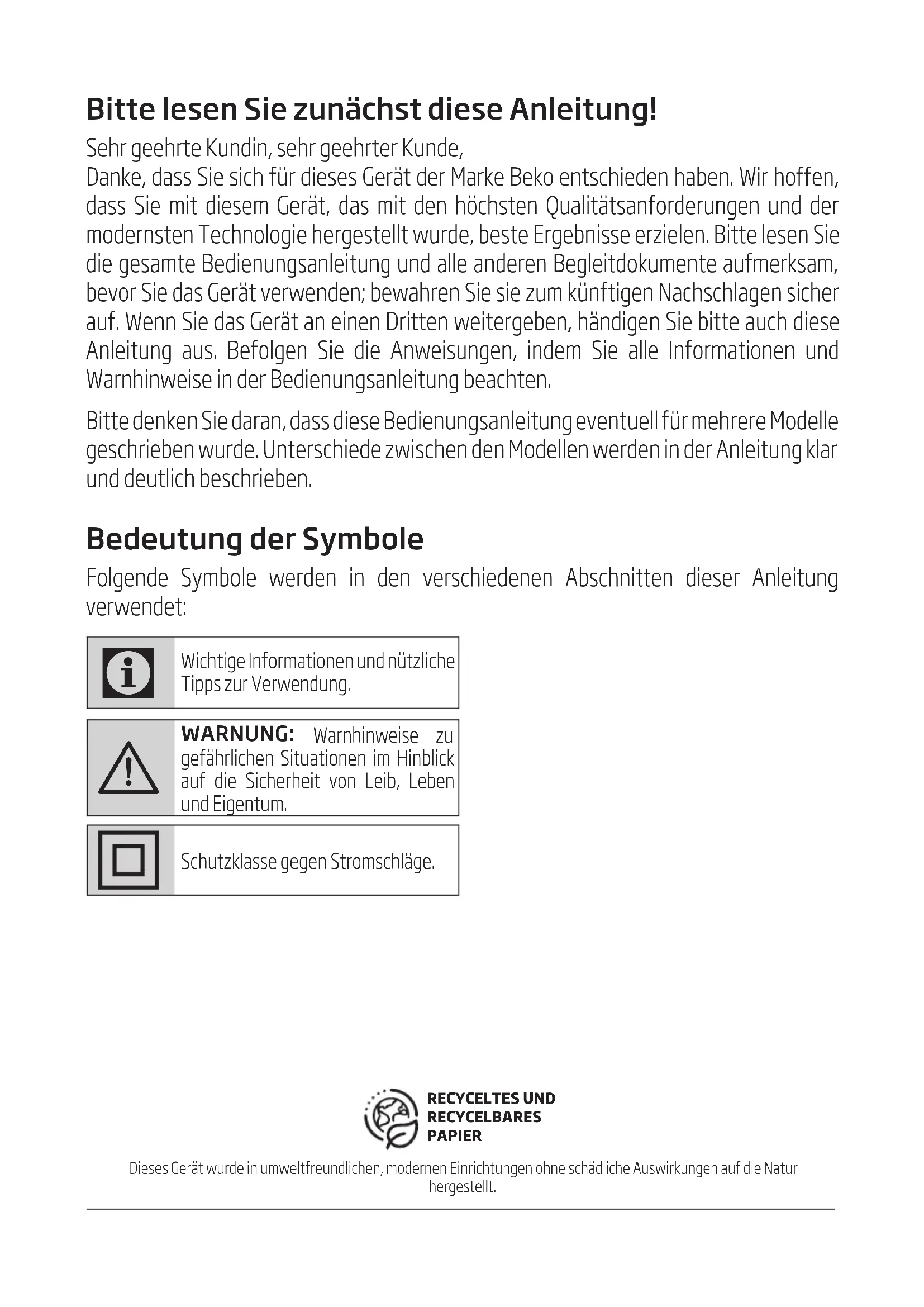 - Dropping the appliance may render it non- operational or cause permanent damage. 4 Cleaning and careBitte lesen Sie zunächst diese Anleitung! Sehr geehrte Kundin, sehr geehrter Kunde, Danke, dass Sie sich für dieses Gerät der Marke Beko entschieden haben. Wir hoffen, dass Sie mit diesem Gerät, das mit den höchsten Qualitätsanforderungen und der modernsten Technologie hergestellt wurde, beste Ergebnisse erzielen. Bitte lesen Sie die gesamte Bedienungsanleitung und alle anderen Begleitdokumente aufmerksam, bevor Sie das Gerät verwenden; bewahren Sie sie zum künftigen Nachschlagen sicher auf. Wenn Sie das Gerät an einen Dritten weitergeben, händigen Sie bitte auch diese Anleitung aus. Befolgen Sie die Anweisungen, indem Sie alle Informationen und Warnhinweise in der Bedienungsanleitung beachten. Bitte denken Sie daran, dass diese Bedienungsanleitung eventuell für mehrere Modelle geschrieben wurde. Unterschiede zwischen den Modellen werden in der Anleitung klar und deutlich beschrieben. Bedeutung der Symbole Folgende Symbole werden in den verschiedenen Abschnitten dieser Anleitung verwendet: