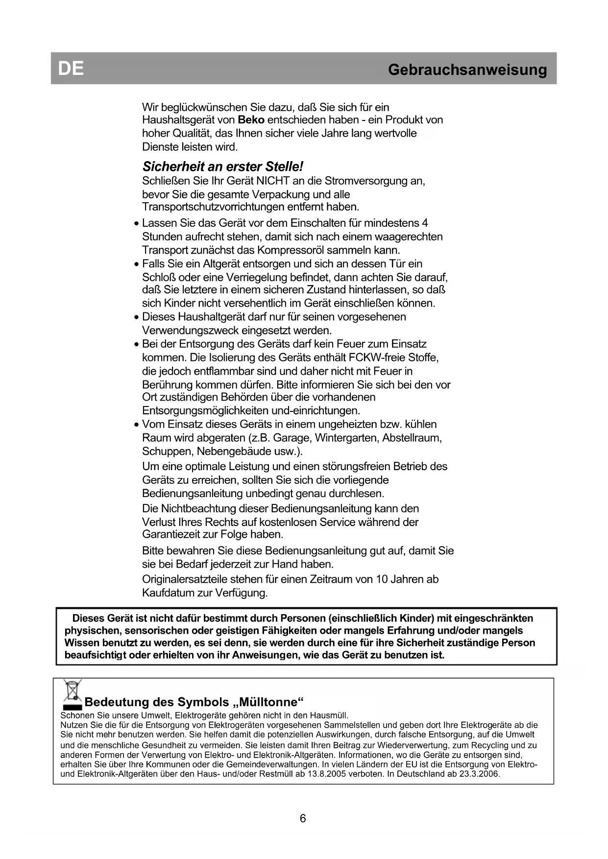 en, wie das Gerät zu benutzen ist. Bedeutung des Symbols „Mülltonne“ Schonen Sie unsere Umwelt, Elektrogeräte gehören nicht in den Hausmüll. Nutzen Sie die für die Entsorgung von Elektrogeräten vorgesehenen Sammelstellen und geben dort Ihre Elektrogeräte ab die Sie nicht mehr benutzen werden. Sie helfen damit die potenziellen Auswirkungen, durch falsche Entsorgung, auf die Umwelt und die menschliche Gesundheit zu vermeiden. Sie leisten damit Ihren Beitrag zur Wiederverwertung, zum Recycling und zu anderen Formen der Verwertung von Elektro- und Elektronik-Altgeräten. Informationen, wo die Geräte zu entsorgen sind, erhalten Sie über Ihre Kommunen oder die Gemeindeverwaltungen. In vielen Ländern der EU ist die Entsorgung von Elektro- und Elektronik-Altgeräten über den Haus- und/oder Restmüll ab 13.8.2005 verboten. In Deutschland ab 23.3.2006.DE Gebrauchsanweisung Voraussetzungen für den elektroanschluss Bevor Sie das Gerät mit einer Steckdose verbinden, sollten Sie sich vergewissern, daß Spannung und Frequenz der Stromversorgung mit den Angaben auf dem Typenschild übereinstimmen, das sich im Innenraum des Geräts befindet. Das Gerät sollte an einer ordnungsgemäß installierten und leicht zugänglichen Steckdose angeschlossen werden, die mit einer Sicherung abgesichert ist. Achtung! Dieses Gerät muß über einen ordnungsgemäßen Erdanschluß verfügen! Reparaturen an elektrischen Geräten dürfen ausschließlich von einem hierfür qualifizierten Fachmann ausgeführt werden. Eine falsch bzw. nicht fachgerecht ausgeführte Reparatur kann Gefahren mit möglicherweise gravierenden Folgen für den Benutzer herbeiführen. Achtung! Wenn die Netzanschlussleitung dieses Gerätes beschädigt wird, muss sie durch den Hersteller oder seinen Kundendienst oder eine ähnlich qualifizierte Person ersetzt werden, um Gefährdungen zu vermeiden. Transportvorschriften