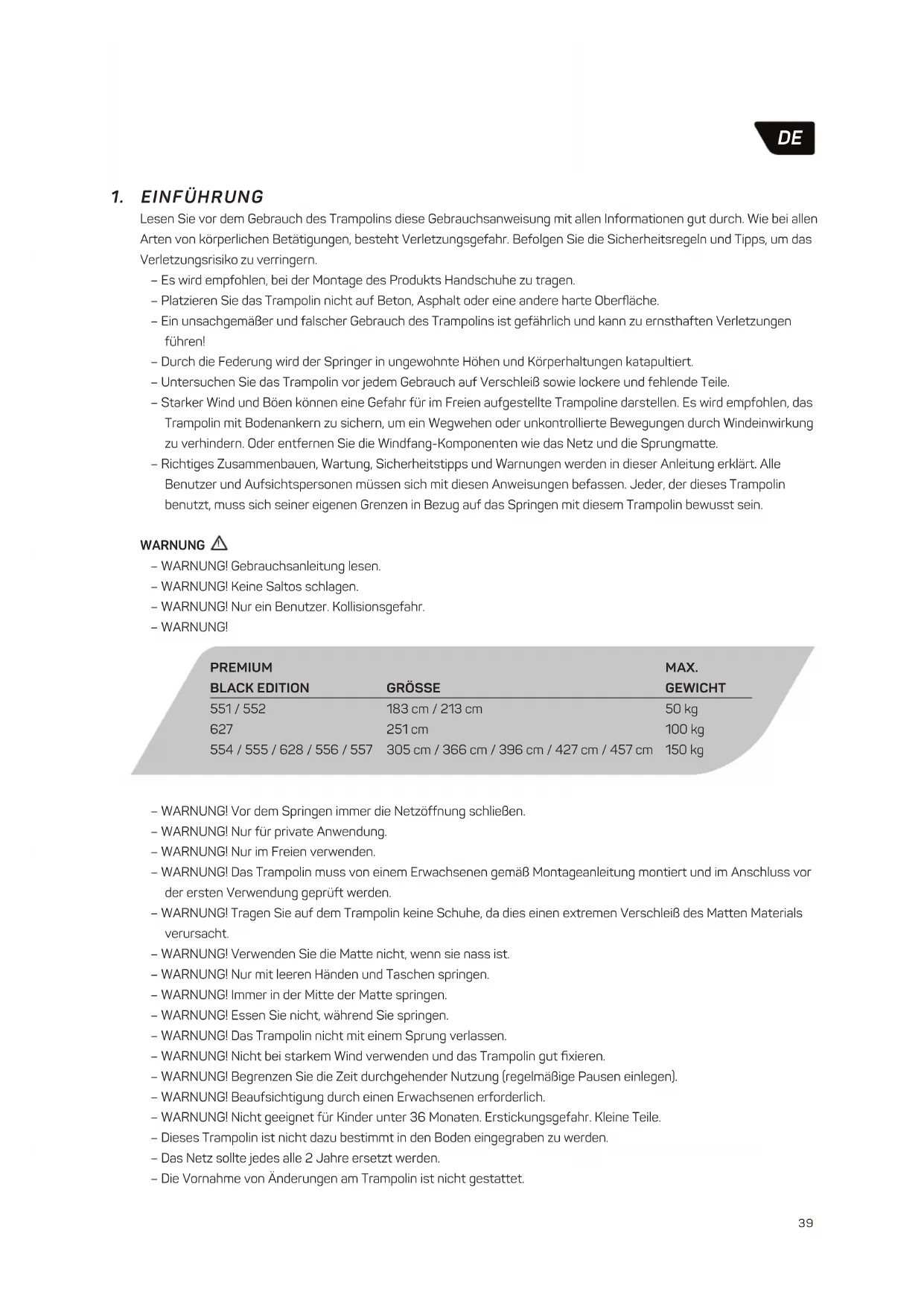 – WARNUNG! Vor dem Springen immer die Netzöffnung schließen. – WARNUNG! Nur für private Anwendung. – WARNUNG! Nur im Freien verwenden. – WARNUNG! Das Trampolin muss von einem Erwachsenen gemäß Montageanleitung montiert und im Anschluss vor der ersten Verwendung geprüft werden. – WARNUNG! Tragen Sie auf dem Trampolin keine Schuhe, da dies einen extremen Verschleiß des Matten Materials verursacht. – WARNUNG! Verwenden Sie die Matte nicht, wenn sie nass ist. – WARNUNG! Nur mit leeren Händen und Taschen springen. – WARNUNG! Immer in der Mitte der Matte springen. – WARNUNG! Essen Sie nicht, während Sie springen. – WARNUNG! Das Trampolin nicht mit einem Sprung verlassen. – WARNUNG! Nicht bei starkem Wind verwenden und das Trampolin gut fixieren. – WARNUNG! Begrenzen Sie die Zeit durchgehender Nutzung (regelmäßige Pausen einlegen). – WARNUNG! Beaufsichtigung durch einen Erwachsenen erforderlich. – WARNUNG! Nicht geeignet für Kinder unter 36 Monaten. Erstickungsgefahr. Kleine Teile. – Dieses Trampolin ist nicht dazu bestimmt in den Boden eingegraben zu werden. – Das Netz sollte jedes alle 2 Jahre ersetzt werden. – Die Vornahme von Änderungen am Trampolin ist nicht gestattet. PREMIUM BLACK EDITION 551 / 552