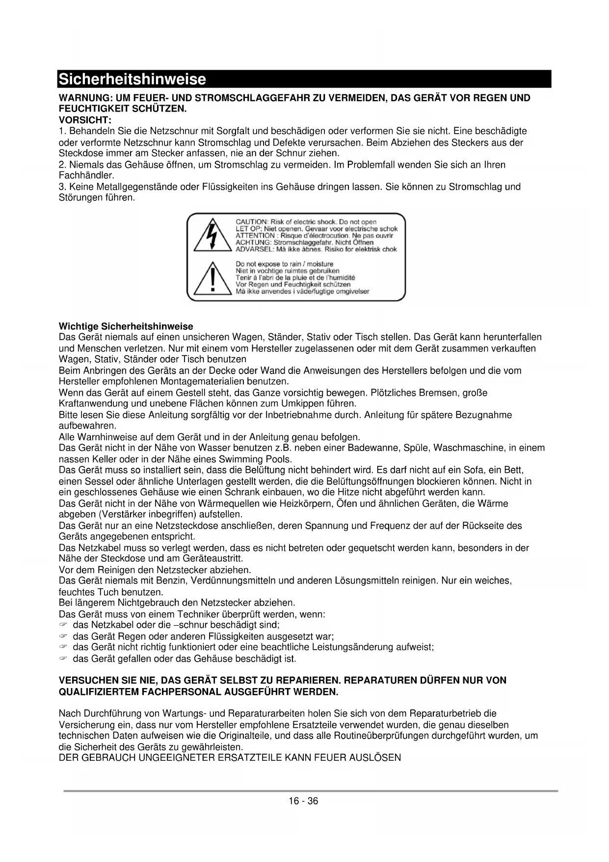 Wichtige Sicherheitshinweise Das Gerät niemals auf einen unsicheren Wagen, Ständer, Stativ oder Tisch stellen. Das Gerät kann herunterfallen und Menschen verletzen. Nur mit einem vom Hersteller zugelassenen oder mit dem Gerät zusammen verkauften Wagen, Stativ, Ständer oder Tisch benutzen Beim Anbringen des Geräts an der Decke oder Wand die Anweisungen des Herstellers befolgen und die vom Hersteller empfohlenen Montagematerialien benutzen. Wenn das Gerät auf einem Gestell steht, das Ganze vorsichtig bewegen. Plötzliches Bremsen, große Kraftanwendung und unebene Flächen können zum Umkippen führen. Bitte lesen Sie diese Anleitung sorgfältig vor der Inbetriebnahme durch. Anleitung für spätere Bezugnahme aufbewahren. Alle Warnhinweise auf dem Gerät und in der Anleitung genau befolgen. Das Gerät nicht in der Nähe von Wasser benutzen z.B. neben einer Badewanne, Spüle, Waschmaschine, in einem nassen Keller oder in der Nähe eines Swimming Pools. Das Gerät muss so installiert sein, dass die Belüftung nicht behindert wird. Es darf nicht auf ein Sofa, ein Bett, einen Sessel oder ähnliche Unterlagen gestellt werden, die die Belüftungsöffnungen blockieren können. Nicht in ein geschlossenes Gehäuse wie einen Schrank einbauen, wo die Hitze nicht abgeführt werden kann. Das Gerät nicht in der Nähe von Wärmequellen wie Heizkörpern, Öfen und ähnlichen Geräten, die Wärme abgeben (Verstärker inbegriffen) aufstellen. Das Gerät nur an eine Netzsteckdose anschließen, deren Spannung und Frequenz der auf der Rückseite des Geräts angegebenen entspricht. Das Netzkabel muss so verlegt werden, dass es nicht betreten oder gequetscht werden kann, besonders in der Nähe der Steckdose und am Geräteaustritt. Vor dem Reinigen den Netzstecker abziehen. Das Gerät niemals mit Benzin, Verdünnungsmitteln und anderen Lösungsmitteln reinigen. Nur ein weiches, feuchtes Tuch benutzen. Bei längerem Nichtgebrauch den Netzstecker abziehen. Das Gerät muss von einem Techniker überprüft werden, wenn: das Netzkabel oder die –schnur beschädigt sind; das Gerät Regen oder anderen Flüssigkeiten ausgesetzt war; das Gerät nicht richtig funktioniert oder eine beachtliche Leistungsänderung aufweist; das Gerät gefallen oder das Gehäuse beschädigt ist. VERSUCHEN SIE NIE, DAS GERÄT SELBST ZU REPARIEREN. REPARATUREN DÜRFEN NUR VON QUALIFIZIERTEM FACHPERSONAL AUSGEFÜHRT WERDEN. Nach Durchführung von Wartungs- und Reparaturarbeiten holen Sie sich von dem Reparaturbetrieb die Versicherung ein, dass nur vom Hersteller empfohlene Ersatzteile verwendet wurden, die genau dieselben technischen Daten aufweisen wie die Originalteile, und dass alle Routineüberprüfungen durchgeführt wurden, um die Sicherheit des Geräts zu gewährleisten. DER GEBRAUCH UNGEEIGNETER ERSATZTEILE KANN FEUER AUSLÖSEN17 - 36 Merkmale Professionelle Audio Stereo-Verstärker von Power Dynamics zeichnen sich durch hohe Ausgangsleistung und ein ausgezeichnetes Preis-/Leistungsverhältnis aus. Die CPA Serie ist ideal für den Einsteiger-DJ, kleine Festanlagen in Pubs, Clubs, Kantinen usw. oder als Ergänzung in grösseren Disco Anlagen