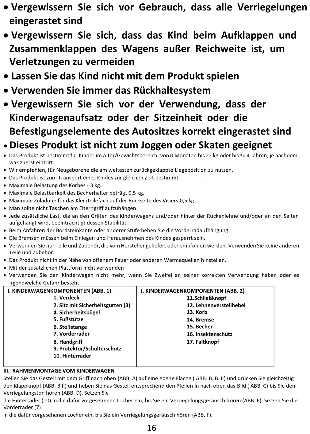 Sehr geehrte Kundin, sehr geehrter Kunde! Vielen Dank für Ihren Kauf eines Produktes von Kinderkraft. Unsere Produkte wurden mit dem Gedanken an Sicherheit und Komfort Ihres Kindes entwickelt. Dieser Kinderwagen ist die ideale Lösung für diejenigen, die Qualität, Modernität und Funktionalität zu schätzen wissen. Bitte machen Sie sich mit der Bedienungsanleitung vertraut und befolgen Sie ihre Empfehlungen. Wichtig – Bitte sorgfältig lesen und für späteres Nachlesen unbedingt aufbewahren WARNUNG!