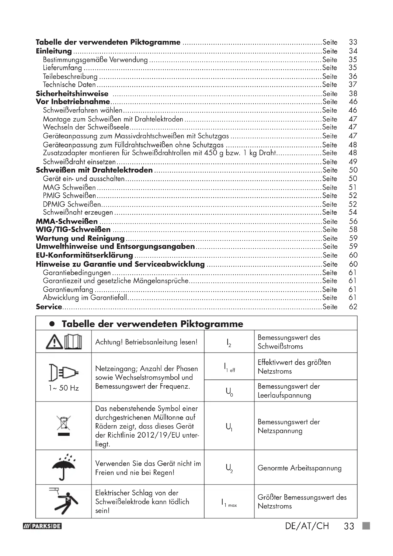 Größter Schweißzeit- Bemessungswert im fortlaufenden Modus t ON (max) Lichtbogenhandschweißen mit umhüllten Stabelektroden Metall-Inert- und Aktivgas- Schweißen einschließlich der Ver- wendung von Fülldraht Wolfram-Inertgas-Schweißen Sie sind gesetzlich verpflichtet, die so gekennzeichneten Geräte einer vom unsortierten Siedlungs- abfall getrennten Erfassung zuzu- führen. Die Entsorgung über den Hausmüll ist untersagt. Multischweißgerät mit Doppelpuls-Technologie PMPS 200 B1 z Einleitung Herzlichen Glückwunsch! Sie haben sich für ein hochwertiges Gerät aus unserem Haus entschieden. Machen Sie sich vor der ersten Inbetriebnahme mit dem Produkt vertraut. Lesen Sie hierzu aufmerksam die nachfolgende Bedienungsanleitung und die Sicherheits- hinweise. Die Inbetriebnahme dieses Werkzeuges darf nur durch unterwiesene Personen erfolgen. NICHT IN DIE HÄNDE VON KINDERN KOMMEN LASSEN!DE/AT/CH