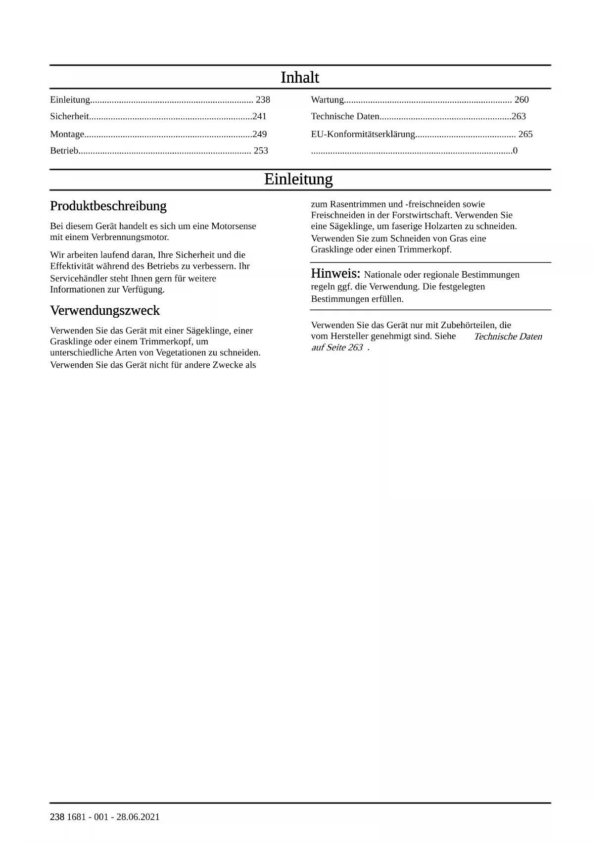 Einleitung Produktbeschreibung Bei diesem Gerät handelt es sich um eine Motorsense mit einem Verbrennungsmotor. Wir arbeiten laufend daran, Ihre Sicherheit und die Effektivität während des Betriebs zu verbessern. Ihr Servicehändler steht Ihnen gern für weitere Informationen zur Verfügung. Verwendungszweck Verwenden Sie das Gerät mit einer Sägeklinge, einer Grasklinge oder einem Trimmerkopf, um unterschiedliche Arten von Vegetationen zu schneiden. Verwenden Sie das Gerät nicht für andere Zwecke als zum Rasentrimmen und -freischneiden sowie Freischneiden in der Forstwirtschaft. Verwenden Sie eine Sägeklinge, um faserige Holzarten zu schneiden. Verwenden Sie zum Schneiden von Gras eine Grasklinge oder einen Trimmerkopf. Hinweis: Nationale oder regionale Bestimmungen regeln ggf. die Verwendung. Die festgelegten Bestimmungen erfüllen. Verwenden Sie das Gerät nur mit Zubehörteilen, die vom Hersteller genehmigt sind. Siehe Technische Daten auf Seite 263