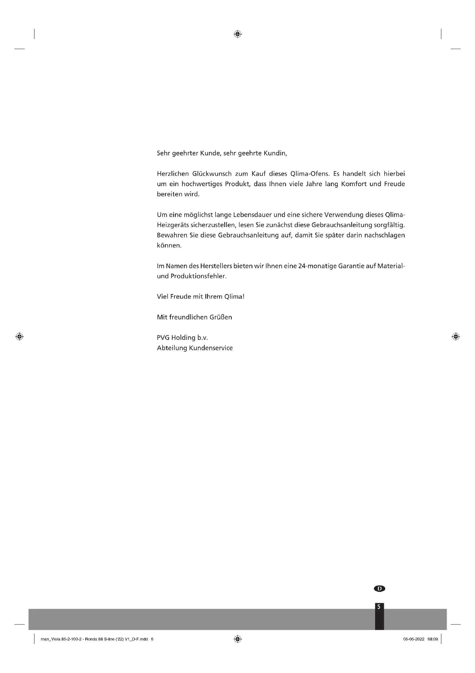 man_Viola 85-2-100-2 - Ronda 88 S-line ('22) V1_D-F.indd 4man_Viola 85-2-100-2 - Ronda 88 S-line ('22) V1_D-F.indd 4 05-05-2022 08:0905-05-2022 08:095 Sehr geehrter Kunde, sehr geehrte Kundin, Herzlichen Glückwunsch zum Kauf dieses Qlima-Ofens. Es handelt sich hierbei um ein hochwertiges Produkt, dass Ihnen viele Jahre lang Komfort und Freude bereiten wird. Um eine möglichst lange Lebensdauer und eine sichere Verwendung dieses Qlima- Heizgeräts sicherzustellen, lesen Sie zunächst diese Gebrauchsanleitung sorgfältig. Bewahren Sie diese Gebrauchsanleitung auf, damit Sie später darin nachschlagen können. Im Namen des Herstellers bieten wir Ihnen eine 24-monatige Garantie auf Material- und Produktionsfehler. Viel Freude mit Ihrem Qlima! Mit freundlichen Grüßen PVG Holding b.v. Abteilung Kundenservice