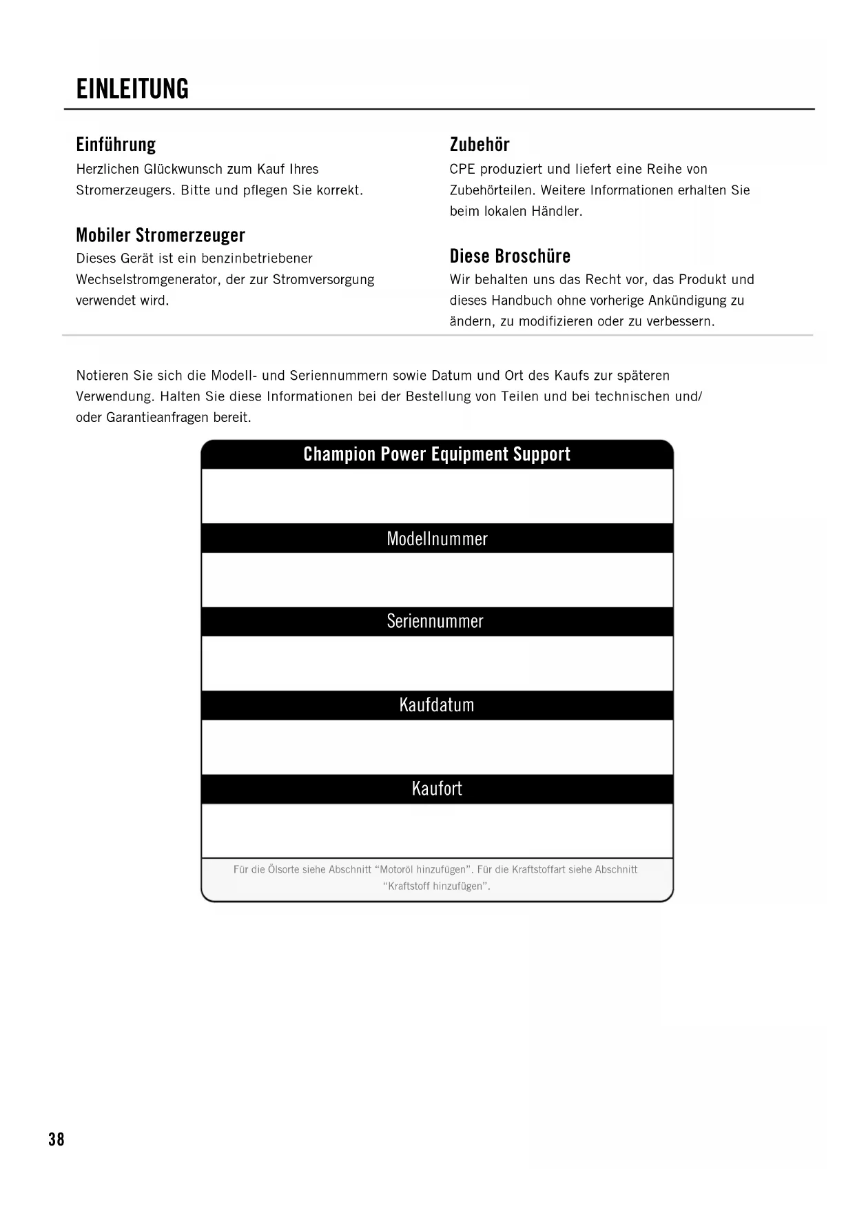 Trådlös inställningsknapp Den trådlösa inställningsknappen är en funktion som låter användaren synka fjärrkontroller med generatorn. Man kan ansluta upp till två fjärrkontroller eller återställa en fjärrkontroll med generatorn. För att återställa en fjärrkontroll eller synka två fjärrkontroller, följ följande steg: 1. Vrid tändningen till läge ”ON”. 2. Vrid batteriomkopplaren till läge ”ON”.3. Tryck ner och håll knappen för trådlös inställning intill den röda lampan (på frampanelen) för ca. tresekunder. Den röda lampan tänds.4. Tryck in och släpp upp ”STOP”-knappen på fjärrkontrollen. Den röda lampan blinkar en gång föratt radera fjärrprogrammet.5. Tryck in och släpp upp ”START”-knappen. Den röda lampan blinkar en gång för att programmera fjärrkontrollen.6. Tryck in och håll knappen för programmering i ca. tre sekunder tills den röda lampan slocknar.7. Testa start- och stoppfunktionerEndast två fjärrkontroller kan vara synkade med varje generator åt gången. NOTE Att byta ut fjärrkontrollens batteri behöver inte kräva någon återställning av fjärrkontrollen. NOTE Parallell användning Två (2) Champion-generatorer kan användas parallellt för att öka den totala mängden ström. Ett Champion-parallellpaket (extra utrustning) krävs för parallell användning. För tillgänglighet av parallellpaket, besök www.championpowerequipment.euDetaljerade instruktioner för installation av parallellpaket och gradering på de anslutna generatorerna finns iparallellpaketets ägarmanual och bruksanvisning. SV38 Champion Power Equipment Support Modellnummer Seriennummer Kaufdatum Kaufort Für die Ölsorte siehe Abschnitt “Motoröl hinzufügen”. Für die Kraftstoffart siehe Abschnitt “Kraftstoff hinzufügen”. Notieren Sie sich die Modell- und Seriennummern sowie Datum und Ort des Kaufs zur späteren Verwendung. Halten Sie diese Informationen bei der Bestellung von Teilen und bei technischen und/ oder Garantieanfragen bereit. Einführung Herzlichen Glückwunsch zum Kauf Ihres Stromerzeugers. Bitte und pflegen Sie korrekt. Mobiler Stromerzeuger Dieses Gerät ist ein benzinbetriebener Wechselstromgenerator, der zur Stromversorgung verwendet wird. Zubehör CPE produziert und liefert eine Reihe von Zubehörteilen. Weitere Informationen erhalten Sie beim lokalen Händler. Diese Broschüre Wir behalten uns das Recht vor, das Produkt und dieses Handbuch ohne vorherige Ankündigung zu ändern, zu modifizieren oder zu verbessern. EINLEITUNG39 Bitte machen Sie sich mit den folgenden Symbolen vertraut. Das Sicherheitssymbol und die Schlüsselwörter sind Sicherheitshinweise. Befolgen Sie alle Sicherheitshinweise, um Unfälle und/ oder Verletzungen zu vermeiden. VORSICHT weist auf eine potenziell gefährliche Situation hin, die, wenn sie nicht vermieden wird, zu leichten oder mittleren Verletzungen führen kann. VORSICHT VORSICHT, die ohne das Sicherheitswarnsymbol verwendet wird, weist auf eine potenziell gefährliche Situation hin, die, wenn sie nicht vermieden wird, zu Sachschäden führen kann. VORSICHT GEFAHR weist auf eine unmittelbar drohenden Gefahr hin, die, wenn sie nicht vermieden wird,zum Tod oder zu schweren Verletzungen führt. GEFAHR WARNUNG weist auf eine potenziell gefährliche Situation hin, die, wenn sie nicht vermieden wird, zu Tod oder schweren Verletzungen führen kann. WARNUNG Wenn Sie Fragen zu Ihrem Generator haben, können wir Ihnen helfen. Bitte wenden Sie sich an Ihren Händler vor Ort. HINWEIS HANDBUCHKONVENTIONEN DE40 SICHERHEITSV ORSCHRIFTEN Das Abgas des Generators enthält Kohlenmonoxid, ein farbloses, geruchloses Giftgas. Das Einatmen von Kohlenmonoxid verursacht Übelkeit, Schwindel, Ohnmacht oder Tod. Wenn Sie sich schwindelig oder schwach fühlen, gehen Sie sofort an die frische Luft. Betreiben Sie den Generator im Freien nur in einem gut belüfteten Bereich. Betreiben Sie den Generator NICHT in einem Gebäude, einschließlich Garagen, Kellern und Schuppen, einem Gehäuse oder Abteil, einschließlich des Stauraums eines Wohnmobils. Lassen Sie KEINE Abgase durch Fenster, Türen, Lüftungsschlitze oder andere Öffnungen gelangen. GEFAHR CARBON MONOXID: Die Verwendung eines Generators in Innenräumen kann Sie in wenigen Minuten töten. GEFAHR Rotierende Teile können Hände, Füße, Haare, Kleidung und/oder Accessoires verwickeln. Dies kann zu einer traumatischen Amputation oder schweren Platzwunden führen Halten Sie Hände und Füße von rotierenden Teilen fern. Binden Sie lange Haare zusammen und entfernen Sie Schmuck. Betreiben Sie das Gerät mit installierten Schutzvorrichtungen. Tragen Sie KEINE lose sitzende Kleidung, baumelnde Kordeln oder Gegenstände, die sich verfangen könnten. GEFAHR Der Generator erzeugt eine starke Spannung. Berühren Sie KEINE blanken Drähte oder Buchsen. Verwenden Sie KEINE Stromkabel, die abgenutzt, beschädigt oder ausgefranst sind. Betreiben Sie den Generator NICHT bei nassem Wetter. Lassen Sie KEINE Kinder oder nicht qualifizierte Personen den Generator bedienen oder warten. Verwenden Sie einen Fehlerstromschutzschalter (FI) in Feuchträumen und Bereichen, die leitfähiges Material enthalten, wie z. B. Metallböden. Verwenden Sie zugelassene Transfer-Geräte, um den Generator ins Stromnetz integrieren. Informieren Sie Ihr Versorgungsunternehmen, bevor Sie den Generator an Ihr Stromnetz anschließen. GEFAHR Funken können zu Bränden oder Stromschlägen führen. Bei der Wartung des Generators: Ziehen Sie das Zündkerzenkabel ab und legen Sie es dort ab, wo es die Kerze nicht berühren kann. Überprüfen Sie NICHT bei gezogener Kerze auf Zündung. Verwenden Sie nur zugelassene Zündkerzenprüfgeräte. WARNUNG Laufende Motoren erzeugen Wärme. Bei Kontakt können schwere Verbrennungen auftreten. Brennbare Materialien können bei Kontakt Feuer fangen. Berühren Sie KEINE heißen Oberflächen. Vermeiden Sie den Kontakt mit heißen Abgasen. Lassen Sie das Gerät vor