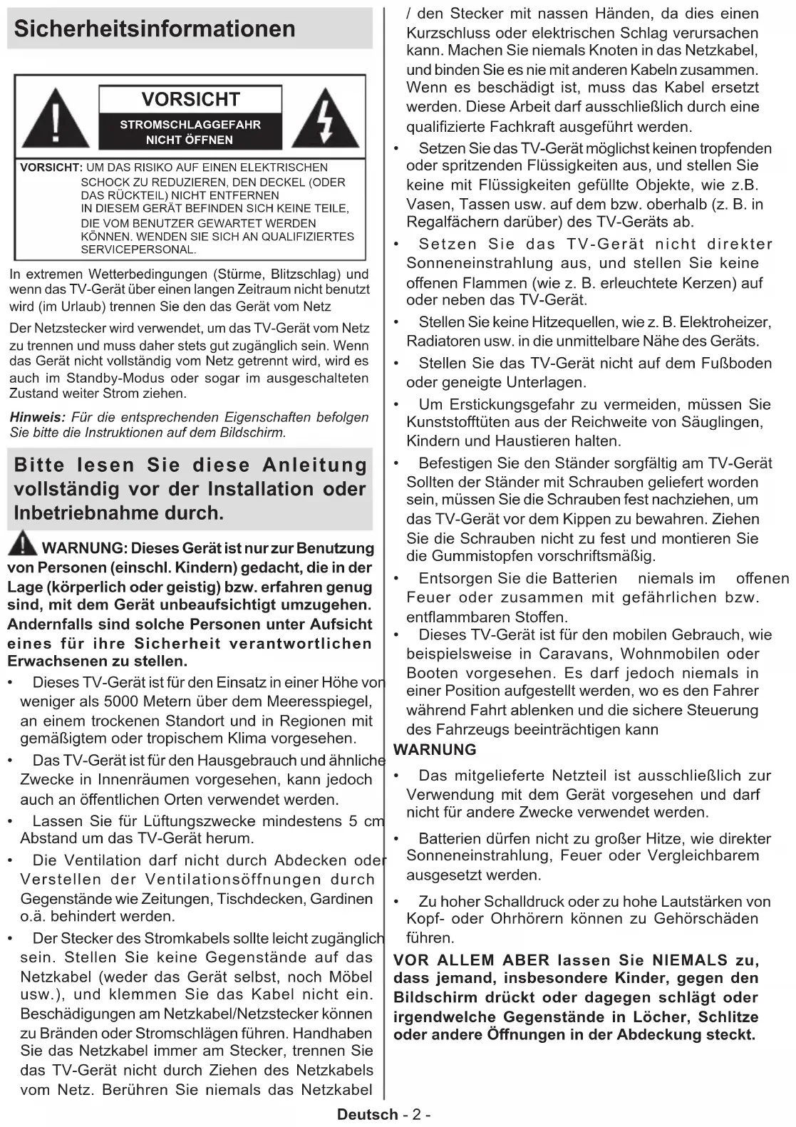 - Informationen zur Entsorgung Deutsch - 2 - Sicherheitsinformationen VORSICHT STROMSCHLAGGEFAHRNICHT ÖFFNENVORSICHT: UM DAS RISIKO AUF EINEN ELEKTRISCHEN SCHOCK ZU REDUZIEREN, DEN DECKEL (ODER DAS RÜCKTEIL) NICHT ENTFERNEN IN DIESEM GERÄT BEFINDEN SICH KEINE TEILE, DIE VOM BENUTZER GEWARTET WERDEN KÖNNEN. WENDEN SIE SICH AN QUALIFIZIERTES SERVICEPERSONAL. Hinweis: Für die entsprechenden Eigenschaften befolgen Sie bitte die Instruktionen auf dem Bildschirm. In extremen Wetterbedingungen (Stürme, Blitzschlag) und wenn das TV-Gerät über einen langen Zeitraum nicht benutzt wird (im Urlaub) trennen Sie den das Gerät vom Netz Der Netzstecker wird verwendet, um das TV-Gerät vom Netz zu trennen und muss daher stets gut zugänglich sein. Wenn das Gerät nicht vollständig vom Netz getrennt wird, wird es auch im Standby-Modus oder sogar im ausgeschalteten Zustand weiter Strom ziehen. Bitte lesen Sie diese Anleitung vollständig vor der Installation oder Inbetriebnahme durch. WARNUNG: Dieses Gerät ist nur zur Benutzung von Personen (einschl. Kindern) gedacht, die in der Lage (körperlich oder geistig) bzw. erfahren genug sind, mit dem Gerät unbeaufsichtigt umzugehen. Andernfalls sind solche Personen unter Aufsicht eines für ihre Sicherheit verantwortlichen Erwachsenen zu stellen. p. 40