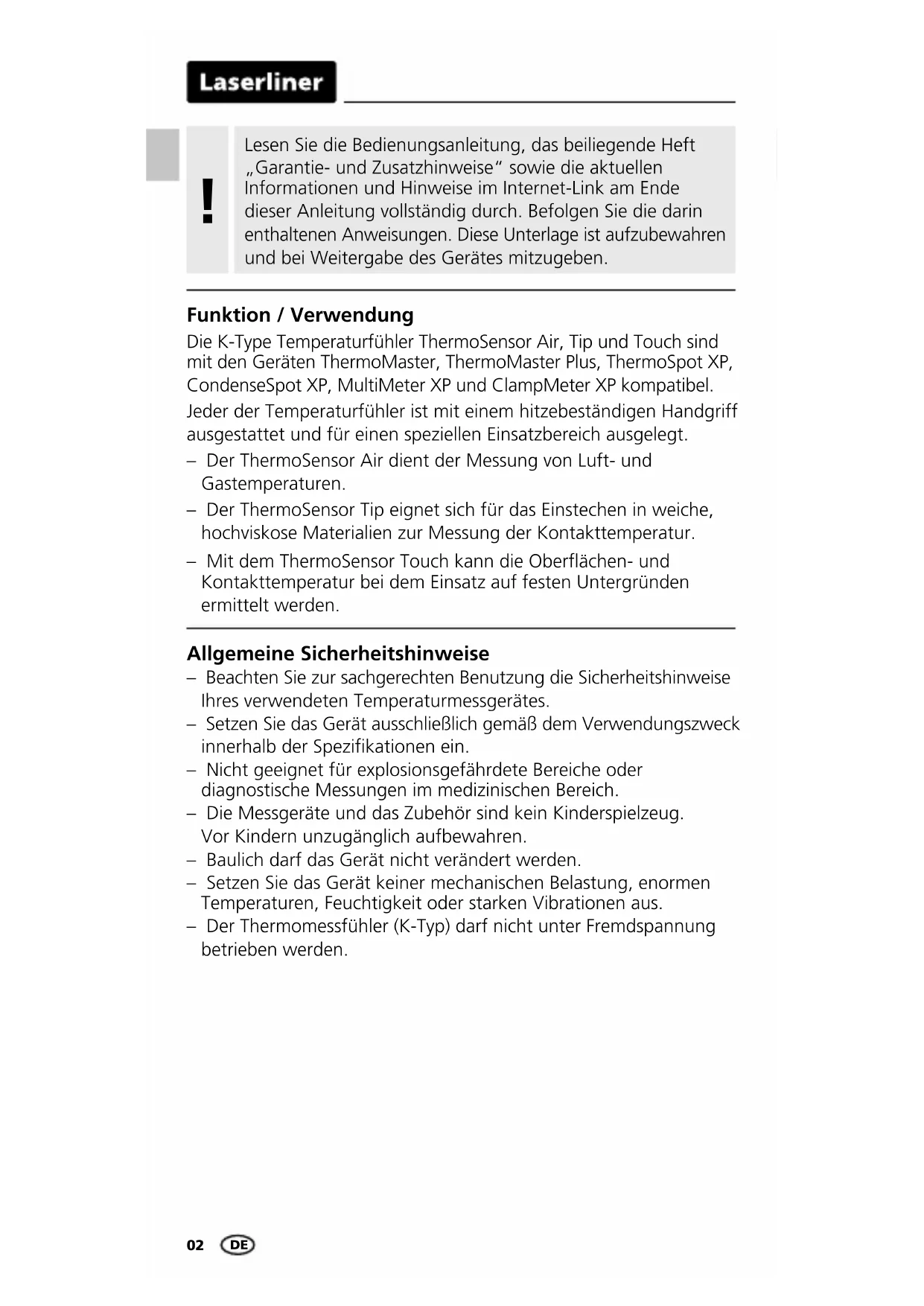EL02 DE DE Funktion / Verwendung Die K-Type Temperaturfühler ThermoSensor Air, Tip und Touch sind mit den Geräten ThermoMaster, ThermoMaster Plus, ThermoSpot XP, CondenseSpot XP, MultiMeter XP und ClampMeter XP kompatibel. Jeder der Temperaturfühler ist mit einem hitzebeständigen Handgriff ausgestattet und für einen speziellen Einsatzbereich ausgelegt. – Der ThermoSensor Air dient der Messung von Luft- und Gastemperaturen. – Der ThermoSensor Tip eignet sich für das Einstechen in weiche, hochviskose Materialien zur Messung der Kontakttemperatur. – Mit dem ThermoSensor Touch kann die Oberächen- und Kontakttemperatur bei dem Einsatz auf festen Untergründen ermittelt werden. Allgemeine Sicherheitshinweise – Beachten Sie zur sachgerechten Benutzung die Sicherheitshinweise Ihres verwendeten Temperaturmessgerätes. – Setzen Sie das Gerät ausschließlich gemäß dem Verwendungszweck innerhalb der Spezikationen ein. – Nicht geeignet für explosionsgefährdete Bereiche oder diagnostische Messungen im medizinischen Bereich. – Die Messgeräte und das Zubehör sind kein Kinderspielzeug. Vor Kindern unzugänglich aufbewahren. – Baulich darf das Gerät nicht verändert werden. – Setzen Sie das Gerät keiner mechanischen Belastung, enormen Temperaturen, Feuchtigkeit oder starken Vibrationen aus. – Der Thermomessfühler (K-Typ) darf nicht unter Fremdspannung betrieben werden. Lesen Sie die Bedienungsanleitung, das beiliegende Heft „Garantie- und Zusatzhinweise“ sowie die aktuellen Informationen und Hinweise im Internet-Link am Ende dieser Anleitung vollständig durch. Befolgen Sie die darin enthaltenen Anweisungen. Diese Unterlage ist aufzubewahren und bei Weitergabe des Gerätes mitzugeben. !ThermoSensor Air / Tip / Touch