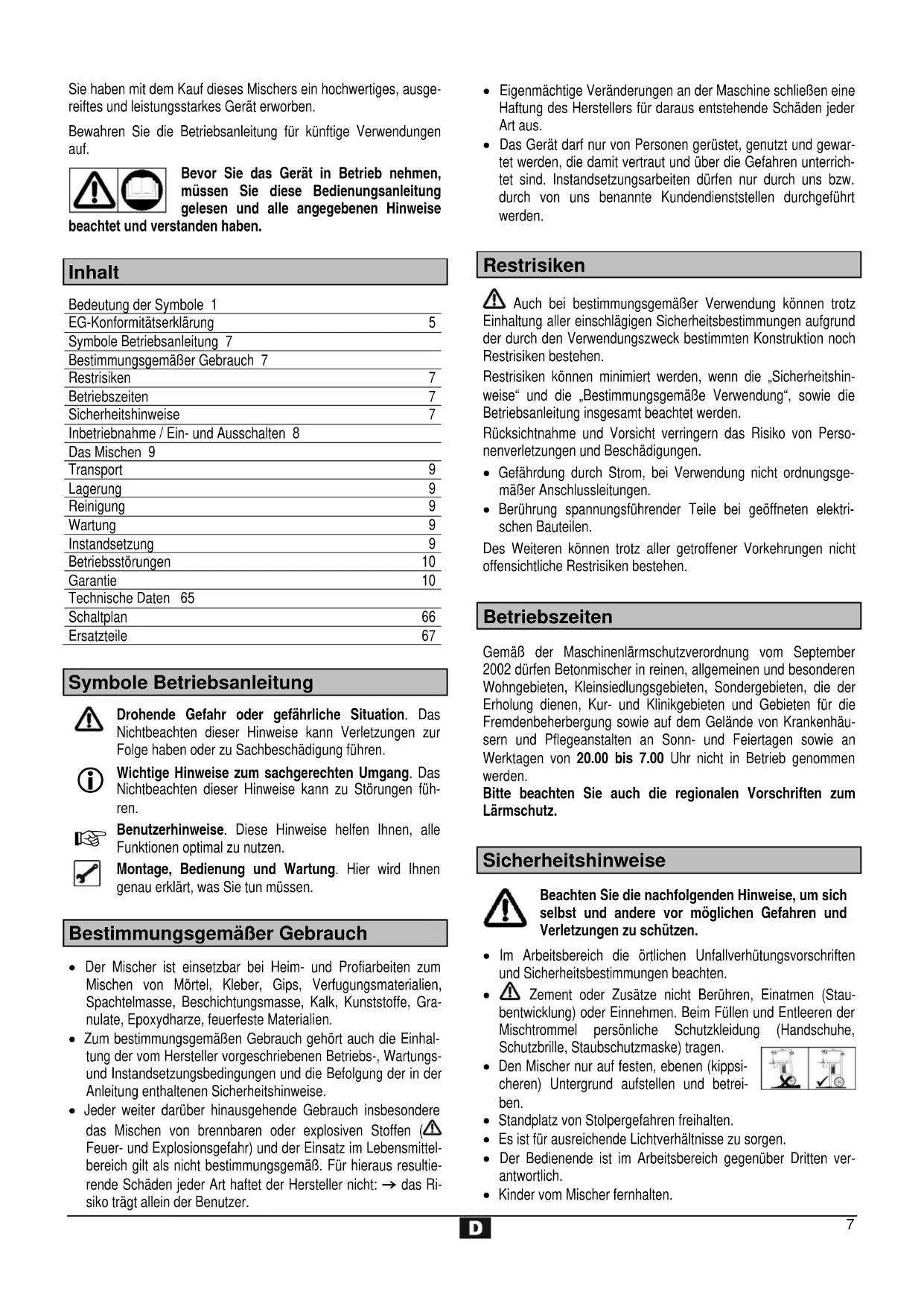 Inhalt Bedeutung der Symbole 1 EG-Konformitätserklärung 5 Symbole Betriebsanleitung 7 Bestimmungsgemäßer Gebrauch 7 Restrisiken 7 Betriebszeiten 7 Sicherheitshinweise 7 Inbetriebnahme / Ein- und Ausschalten 8 Das Mischen 9 Transport 9 Lagerung 9 Reinigung 9 Wartung 9 Instandsetzung 9 Betriebsstörungen 10 Garantie 10 Technische Daten 65 Schaltplan 66 Ersatzteile 67