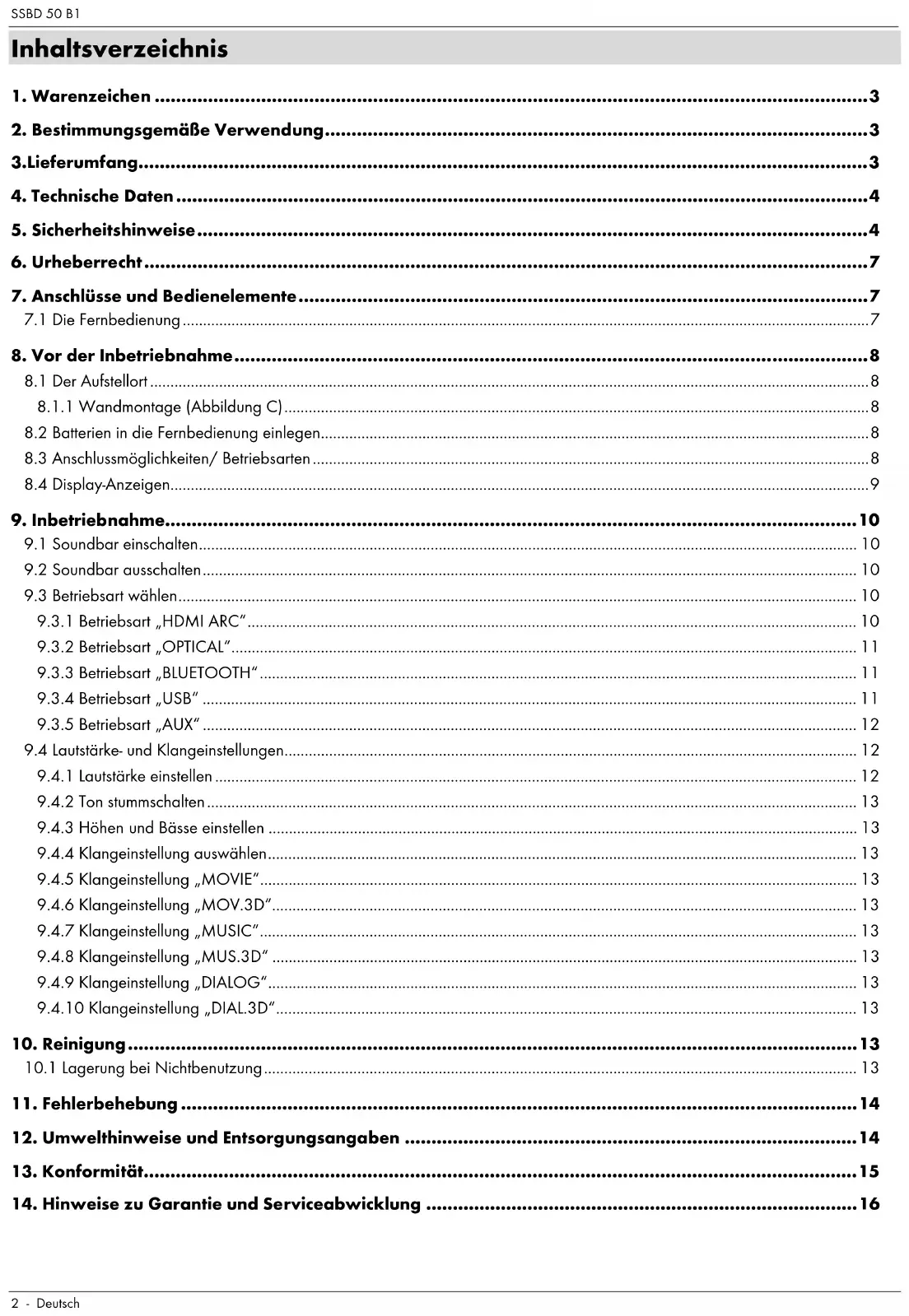 - 14. Hinweise zu Garantie und Serviceabwicklung SSBD 50 B1 Deutsch - 3 Herzlichen Glückwunsch! Mit dem Kauf der SilverCrest Soundbar haben Sie sich für ein hochwertiges Produkt entschieden. Machen Sie sich vor der ersten Inbetriebnahme mit der Soundbar vertraut und lesen Sie diese Bedienungsanleitung aufmerksam durch. Beachten Sie vor allem die Sicherheitshinweise und benutzen Sie die Soundbar nur, wie in dieser Bedienungsanleitung beschrieben und für die angegebenen Einsatzbereiche. Bewahren Sie diese Bedienungsanleitung gut auf. Händigen Sie alle Unterlagen bei Weitergabe der Soundbar an Dritte ebenfalls mit aus. Die Soundbar erfüllt alle in der EU-Konformitätserklärung genannten Normen und Richtlinien. Bei eigenmächtigen Umbauten des Gerätes und hieraus resultierenden Schäden oder Störungen ist jegliche Haftung seitens des Herstellers ausgeschlossen. Benutzen Sie nur das vom Hersteller angegebene Zubehör. Bitte beachten Sie die Landesvorschriften bzw. Gesetze des Einsatzlandes. p. 16