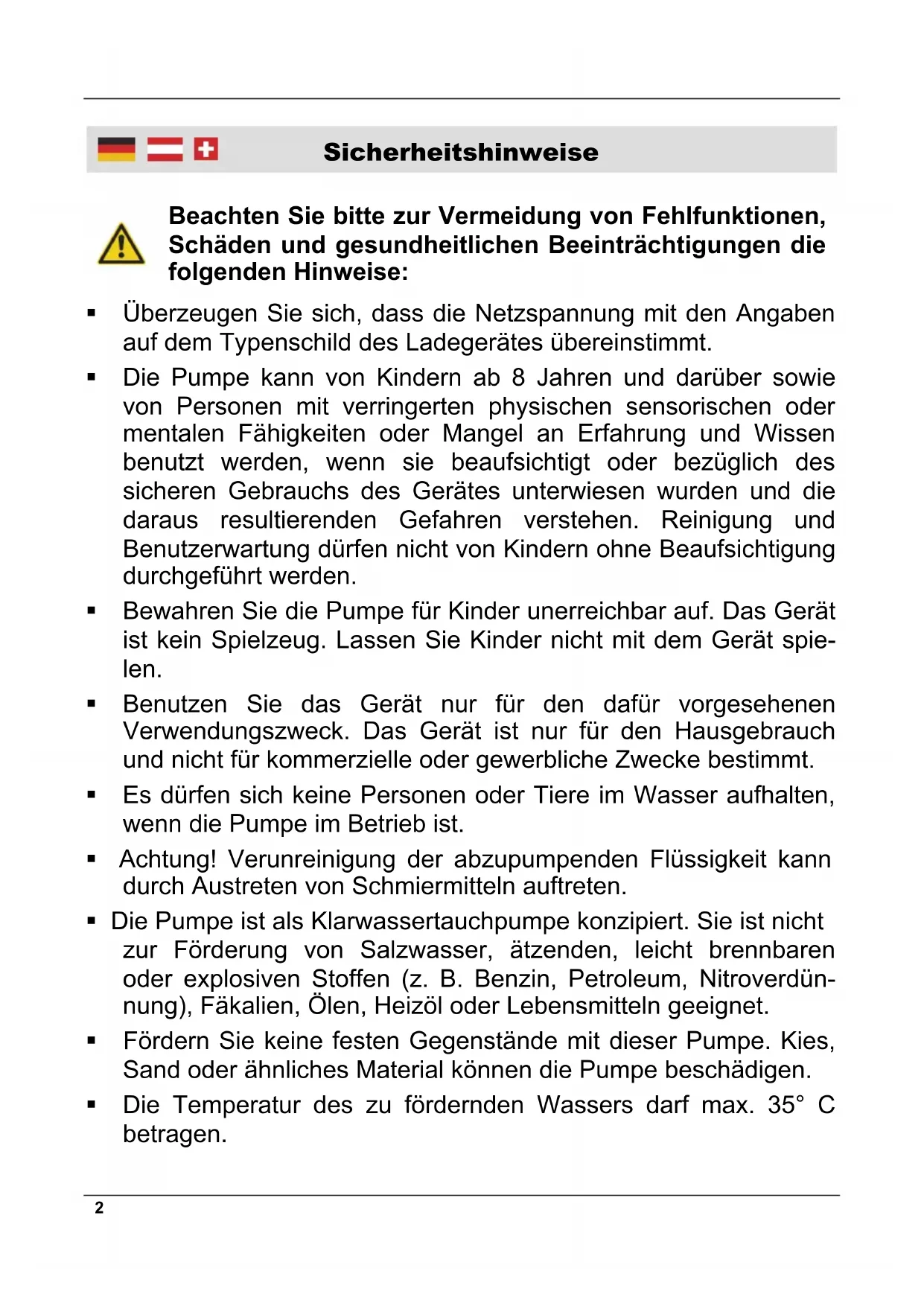 Sicherheitshinweise Überzeugen Sie sich, dass die Netzspannung mit den Angaben auf dem Typenschild des Ladegerätes übereinstimmt. Die Pumpe kann von Kindern ab 8 Jahren und darüber sowie von Personen mit verringerten physischen sensorischen oder mentalen Fähigkeiten oder Mangel an Erfahrung und Wissen benutzt werden, wenn sie beaufsichtigt oder bezüglich des sicheren Gebrauchs des Gerätes unterwiesen wurden und die daraus resultierenden Gefahren verstehen. Reinigung und Benutzerwartung dürfen nicht von Kindern ohne Beaufsichtigung durchgeführt werden. Bewahren Sie die Pumpe für Kinder unerreichbar auf. Das Gerät ist kein Spielzeug. Lassen Sie Kinder nicht mit dem Gerät spie- len. Benutzen Sie das Gerät nur für den dafür vorgesehenen Verwendungszweck. Das Gerät ist nur für den Hausgebrauch und nicht für kommerzielle oder gewerbliche Zwecke bestimmt. Es dürfen sich keine Personen oder Tiere im Wasser aufhalten, wenn die Pumpe im Betrieb ist. Achtung! Verunreinigung der abzupumpenden Flüssigkeit kann durch Austreten von Schmiermitteln auftreten. Die Pumpe ist als Klarwassertauchpumpe konzipiert. Sie ist nicht zur Förderung von Salzwasser, ätzenden, leicht brennbaren oder explosiven Stoffen (z. B. Benzin, Petroleum, Nitroverdün- nung), Fäkalien, Ölen, Heizöl oder Lebensmitteln geeignet. Fördern Sie keine festen Gegenstände mit dieser Pumpe. Kies, Sand oder ähnliches Material können die Pumpe beschädigen. Die Temperatur des zu fördernden Wassers darf max. 35° C betragen. Beachten Sie bitte zur Vermeidung von Fehlfunktionen, Schäden und gesundheitlichen Beeinträchtigungen die folgenden Hinweise:3 Sicherheitshinweise Betreiben Sie die Pumpe nicht längere Zeit unbeaufsichtigt. Das Kabel darf nicht ausgetauscht oder repariert werden und es dürfen auch keine Veränderungen an dem Kabel vorgenommen werden, wie Schaltereinbau oder ähnliches. Klemmen oder knicken Sie das Kabel nicht. Halten Sie es von heißen Oberflächen fern. Benutzen Sie das Kabel nicht zum Transportieren der Pumpe. Hängen Sie die Pumpe bei Nichtgebrauch keinesfalls an dem Kabel auf. Schützen Sie die Pumpe vor Frost. Schützen Sie die Pumpe vor Trockenlauf. Die Pumpe muss im Betrieb ständig unter Wasser eingetaucht sein. Ziehen Sie den Akku heraus, bevor Sie die Pumpe reinigen oder längere Zeit nicht benutzen. Falls an der Pumpe selbst oder am Kabel Schäden auftreten, benutzen Sie diese nicht mehr und lassen Sie den Schaden durch einen Fachmann instandsetzen oder wenden Sie sich an die Westfalia Kundenbetreuung. Zerlegen Sie die Pumpe nicht und unternehmen Sie keine eigenen Reparaturversuche. Das Ladegerät ist nur für den Akku dieser Pumpe bestimmt. Laden Sie keine anderen Geräte mit diesem Ladegerät. Laden Sie den Akku nicht mit anderen Ladegeräten. Ziehen Sie bei Nichtbenutzung das Ladegerät aus der Steck- dose. Behandeln Sie die Pumpe mit Umsicht. Lassen Sie die Pumpe nicht fallen und setzen Sie die Pumpe weder Druck, anderen mechanischen Belastungen oder extremer Hitze oder Kälte aus. Lagern Sie den Akku, das Ladegerät und die Pumpe an einem kühlen und trockenen Ort im Innenbereich. Schützen Sie Akku und Ladegerät vor Feuchtigkeit. Betreiben Sie das Ladegerät nicht im Freien.4 Sicherheitshinweise Laden, betreiben und lagern Sie den Akku nur bei Umgebungs- temperaturen zwischen 10º C und 35º C. Das Gerät ist für den Einsatz bis 2000 m über Meereshöhe ausgelegt. Achtung Unfallgefahr! Schließen Sie den Akku nicht kurz, setzen Sie ihn niemals Nässe aus und bewahren Sie ihn nicht zusam- men mit Metallgegenständen auf, die die Kontakte kurzschließen könnten. Der Akku könnte sich stark erhitzen, brennen oder explodieren.Safet