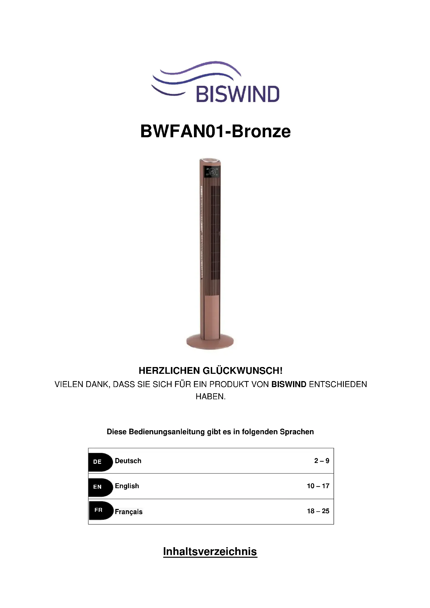 HERZLICHEN GLÜCKWUNSCH! VIELEN DANK, DASS SIE SICH FÜR EIN PRODUKT VON BISWIND ENTSCHIEDEN HABEN. Diese Bedienungsanleitung gibt es in folgenden Sprachen Deutsch 2 – 9 English 10 – 17 Français 18 – 25