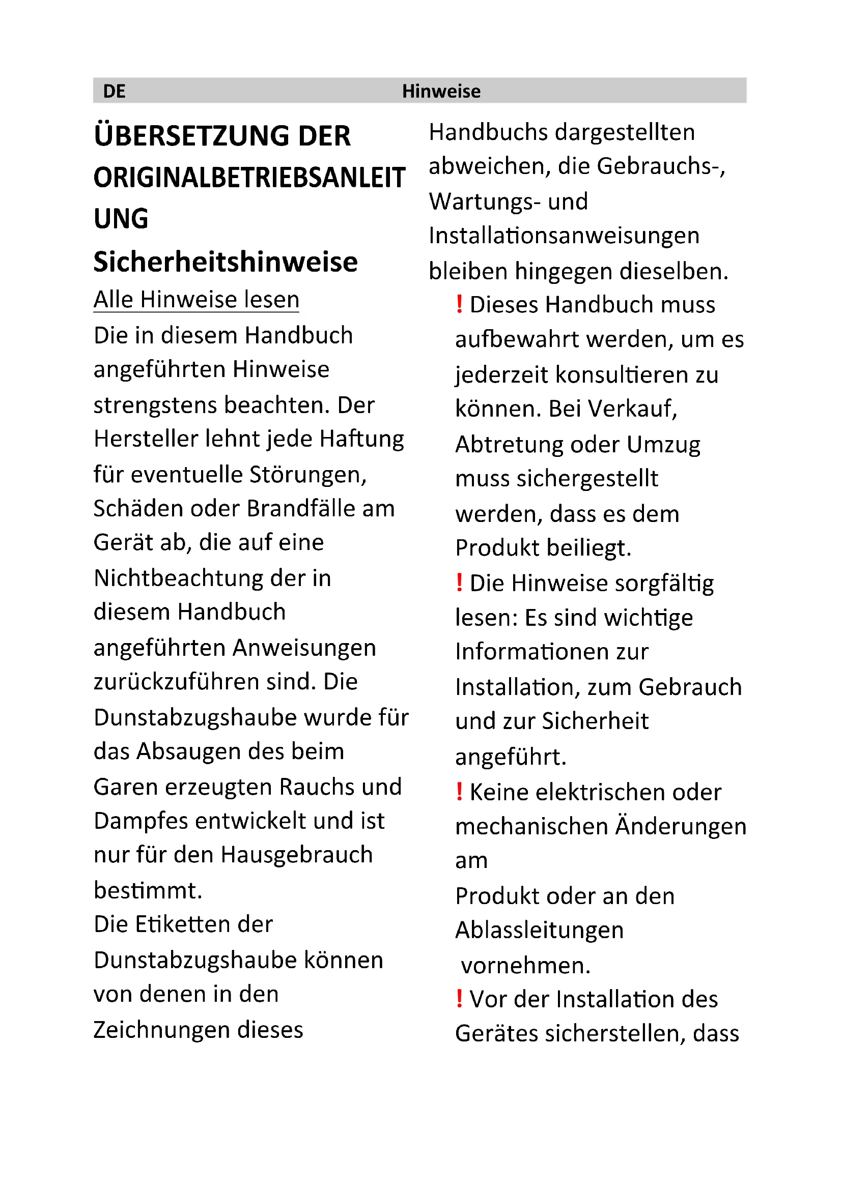 ÜBERSETZUNG DER ORIGINALBETRIEBSANLEIT UNG Sicherheitshinweise Alle Hinweise lesen Die in diesem Handbuch angeführten Hinweise strengstens beachten. Der Hersteller lehnt jede Haftung für eventuelle Störungen, Schäden oder Brandfälle am Gerät ab, die auf eine Nichtbeachtung der in diesem Handbuch angeführten Anweisungen zurückzuführen sind. Die Dunstabzugshaube wurde für das Absaugen des beim Garen erzeugten Rauchs und Dampfes entwickelt und ist nur für den Hausgebrauch bestimmt. Die Etiketten der Dunstabzugshaube können von denen in den Zeichnungen dieses Handbuchs dargestellten abweichen, die Gebrauchs-, Wartungs- und Installationsanweisungen bleiben hingegen dieselben. ! Dieses Handbuch muss aufbewahrt werden, um es jederzeit konsultieren zu können. Bei Verkauf, Abtretung oder Umzug muss sichergestellt werden, dass es dem Produkt beiliegt. ! Die Hinweise sorgfältig lesen: Es sind wichtige Informationen zur Installation, zum Gebrauch und zur Sicherheit angeführt. ! Keine elektrischen oder mechanischen Änderungen