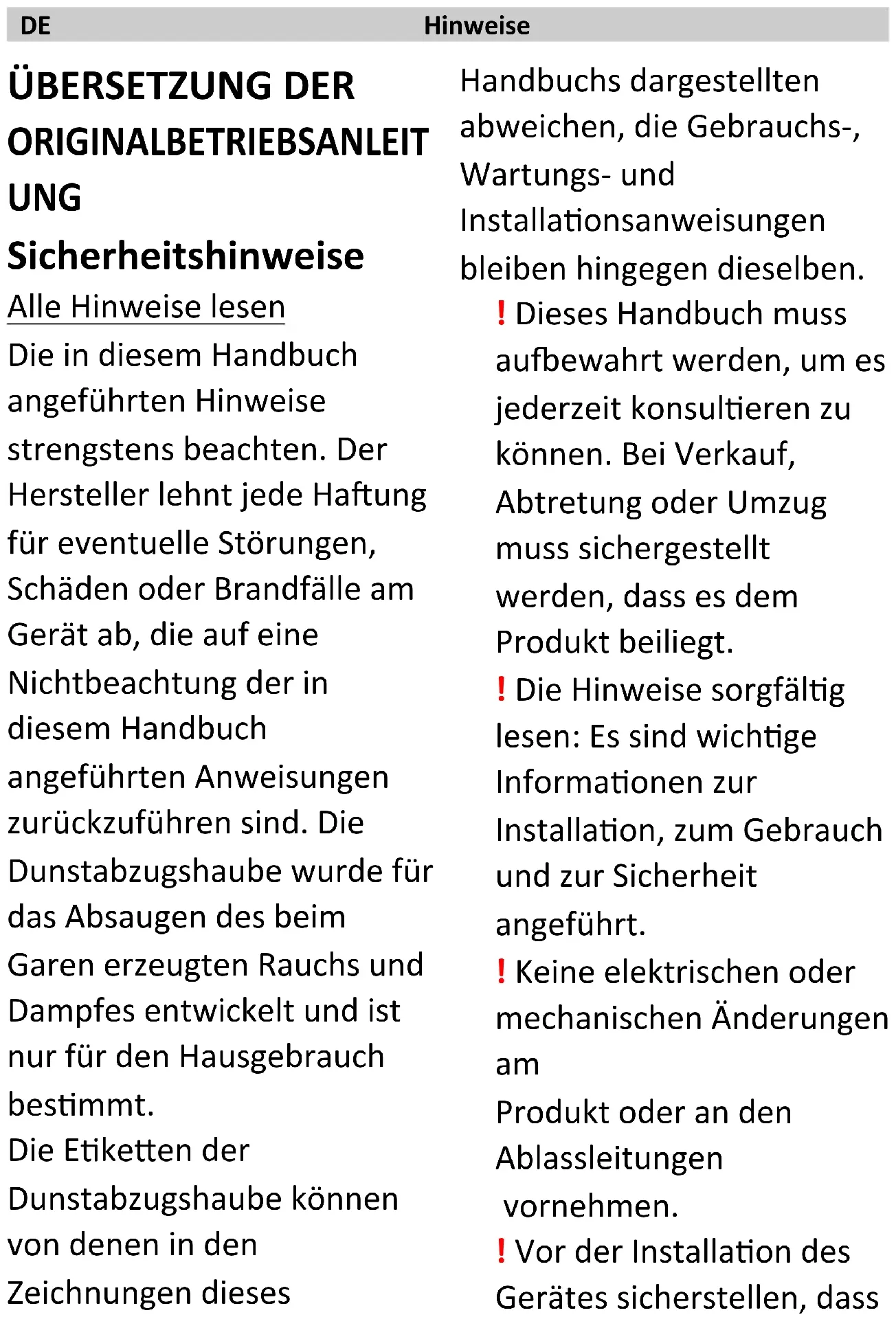 ÜBERSETZUNG DER ORIGINALBETRIEBSANLEIT UNG Sicherheitshinweise Alle Hinweise lesen Die in diesem Handbuch angeführten Hinweise strengstens beachten. Der Hersteller lehnt jede Haftung für eventuelle Störungen, Schäden oder Brandfälle am Gerät ab, die auf eine Nichtbeachtung der in diesem Handbuch angeführten Anweisungen zurückzuführen sind. Die Dunstabzugshaube wurde für das Absaugen des beim Garen erzeugten Rauchs und Dampfes entwickelt und ist nur für den Hausgebrauch bestimmt. Die Etiketten der Dunstabzugshaube können von denen in den Zeichnungen dieses Handbuchs dargestellten abweichen, die Gebrauchs-, Wartungs- und Installationsanweisungen bleiben hingegen dieselben. ! Dieses Handbuch muss aufbewahrt werden, um es jederzeit konsultieren zu können. Bei Verkauf, Abtretung oder Umzug muss sichergestellt werden, dass es dem Produkt beiliegt. ! Die Hinweise sorgfältig lesen: Es sind wichtige Informationen zur Installation, zum Gebrauch und zur Sicherheit angeführt. ! Keine elektrischen oder mechanischen Änderungen