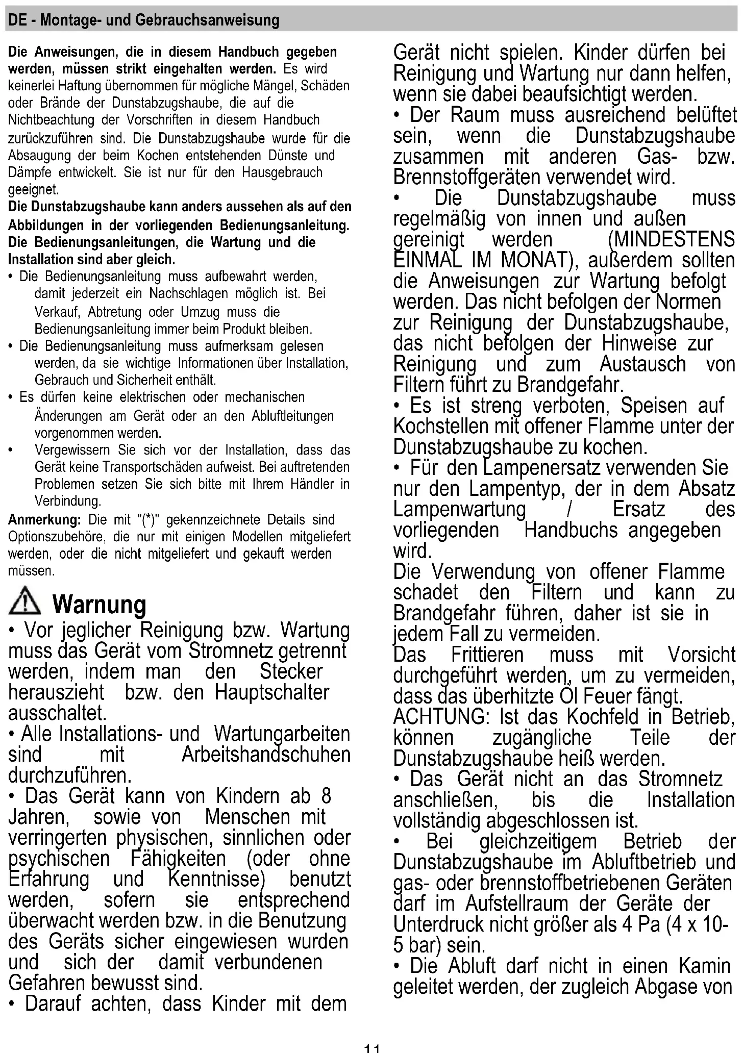 On some models ONLY: A Non Return Backdraft Damper is included in the supply, as optional accessory to be installed under certain installation conditions (i.e. if there is no protection against accidental backdraft of air from the outside). The damper must be installed inside the dedicated housing, inside of the Air Outlet Fitting, before installing the flue. Fig. 1511 DE - Montage- und Gebrauchsanweisung Die Anweisungen, die in diesem Handbuch gegeben werden, müssen strikt eingehalten werden. Es wird keinerlei Haftung übernommen für mögliche Mängel, Schäden oder Brände der Dunstabzugshaube, die auf die Nichtbeachtung der Vorschriften in diesem Handbuch zurückzuführen sind. Die Dunstabzugshaube wurde für die Absaugung der beim Kochen entstehenden Dünste und Dämpfe entwickelt. Sie ist nur für den Hausgebrauch geeignet. Die Dunstabzugshaube kann anders aussehen als auf den Abbildungen in der vorliegenden Bedienungsanleitung. Die Bedienungsanleitungen, die Wartung und die Installation sind aber gleich.