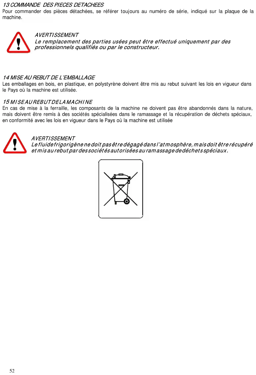 Eingriffe, die von Fachpersonal oder vom Hersteller durchgeführt werden müssen In Folge die Wartungseingriffe, die eine spezifische technische Kompetenz erfordern und die folglich von Fachpersonal oder vom Hersteller durchgeführt werden müssen Der Benutzer darf folgende Operationen auf keinen Fall ausführen: Auswechslung der elektrischen Bauteile Eingriffe an der elektrischen Anlage Reparatur mechanischer Teile Eingriffe an der Kühlanlage Eingriffe an der Steuerschalttafel, an den Betriebsschaltern, Halt und Nothalt Eingriffe an den Schutz- und Sicherheitsvorrichtungen