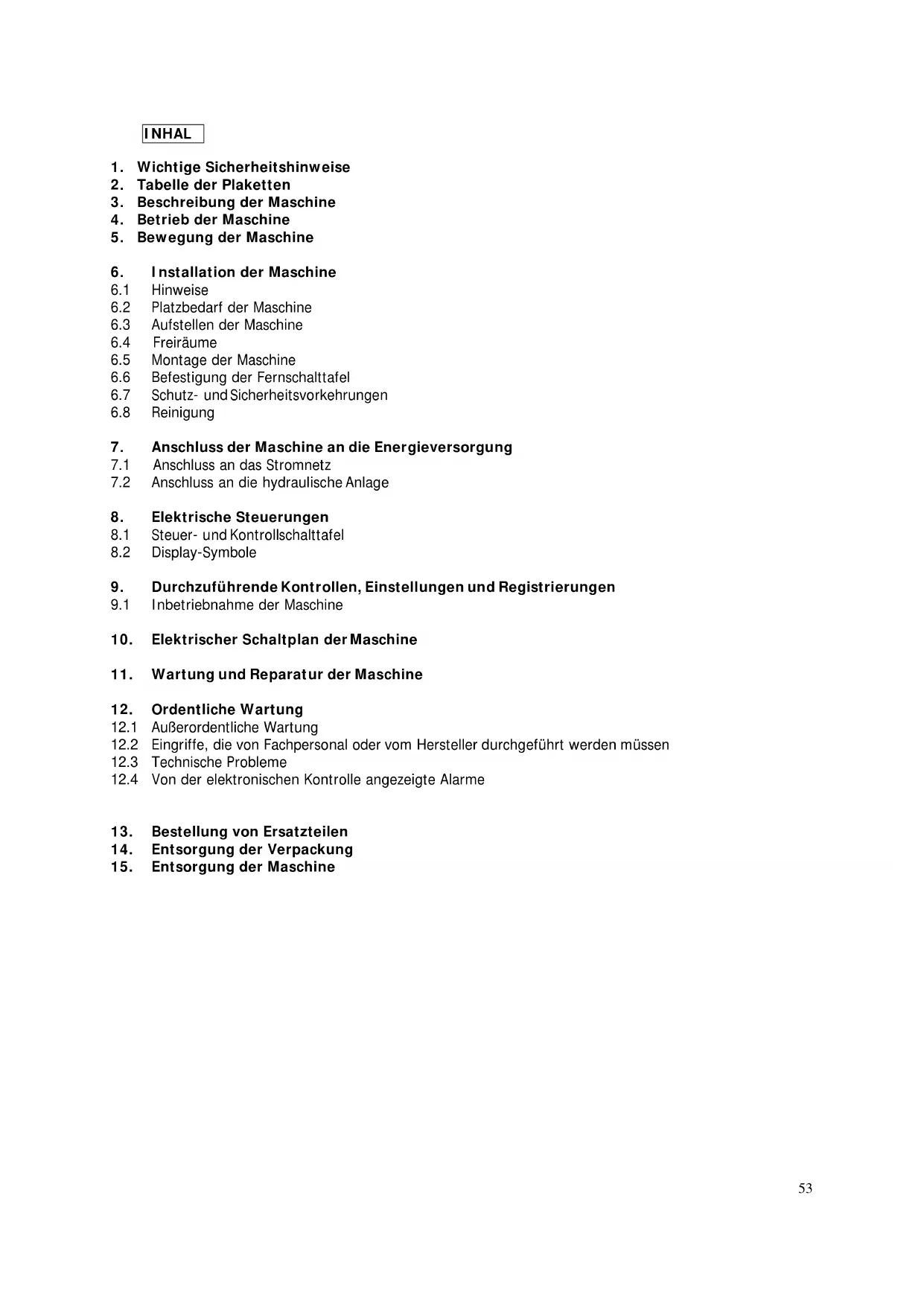 Eingriffe, die von Fachpersonal oder vom Hersteller durchgeführt werden müssen In Folge die Wartungseingriffe, die eine spezifische technische Kompetenz erfordern und die folglich von Fachpersonal oder vom Hersteller durchgeführt werden müssen Der Benutzer darf folgende Operationen auf keinen Fall ausführen: Auswechslung der elektrischen Bauteile Eingriffe an der elektrischen Anlage Reparatur mechanischer Teile Eingriffe an der Kühlanlage Eingriffe an der Steuerschalttafel, an den Betriebsschaltern, Halt und Nothalt Eingriffe an den Schutz- und Sicherheitsvorrichtungen