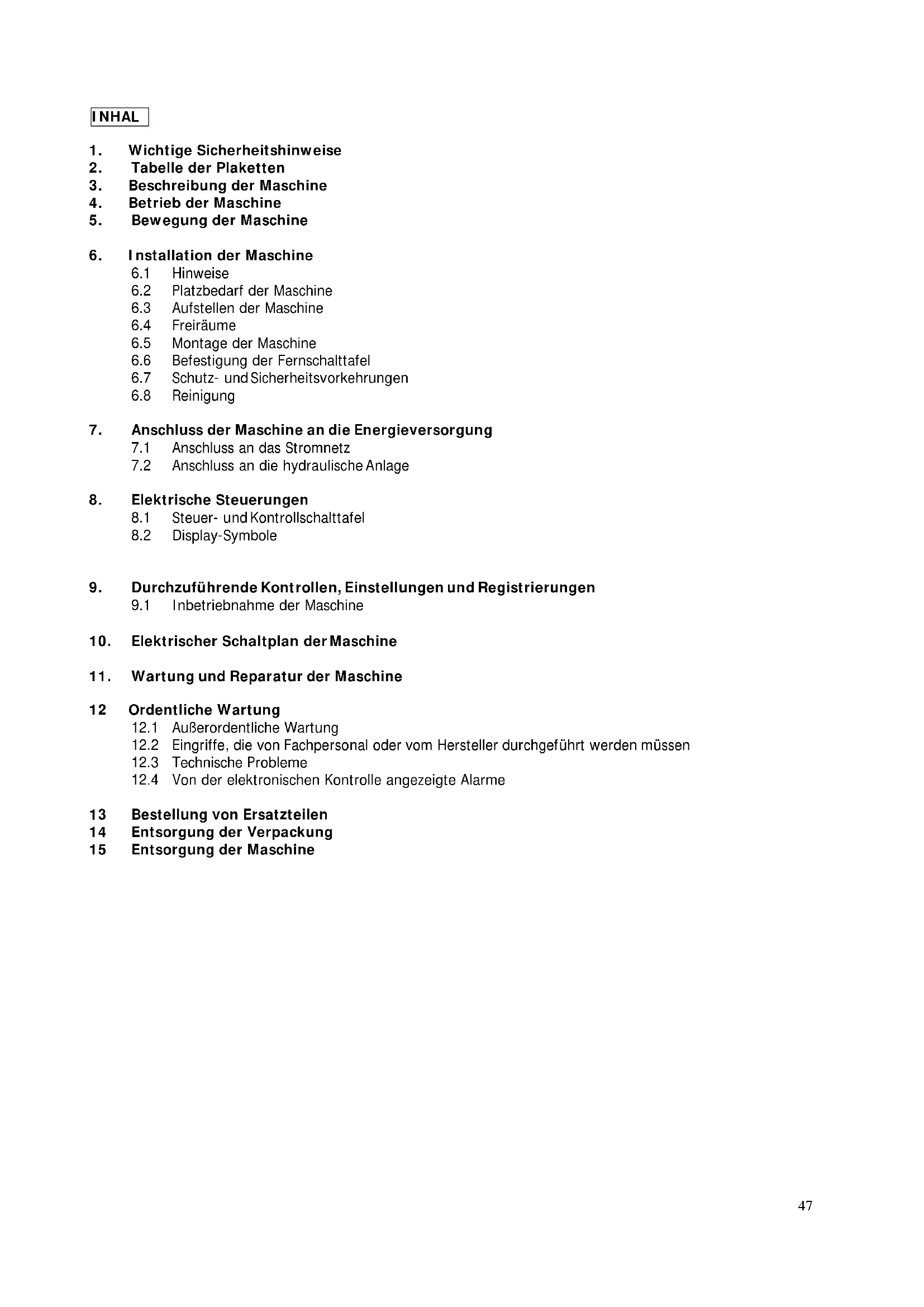 Eingriffe, die von Fachpersonal oder vom Hersteller durchgeführt werden müssen In Folge die Wartungseingriffe, die eine spezifische technische Kompetenz erfordern und die folglich von Fachpersonal oder vom Hersteller durchgeführt werden müssen Der Benutzer darf folgende Operationen auf keinen Fall ausführen: Auswechslung der elektrischen Bauteile Eingriffe an der elektrischen Anlage Reparatur mechanischer Teile Eingriffe an der Kühlanlage Eingriffe an der Steuerschalttafel, an den Betriebsschaltern, Halt und Nothalt Eingriffe an den Schutz- und Sicherheitsvorrichtungen