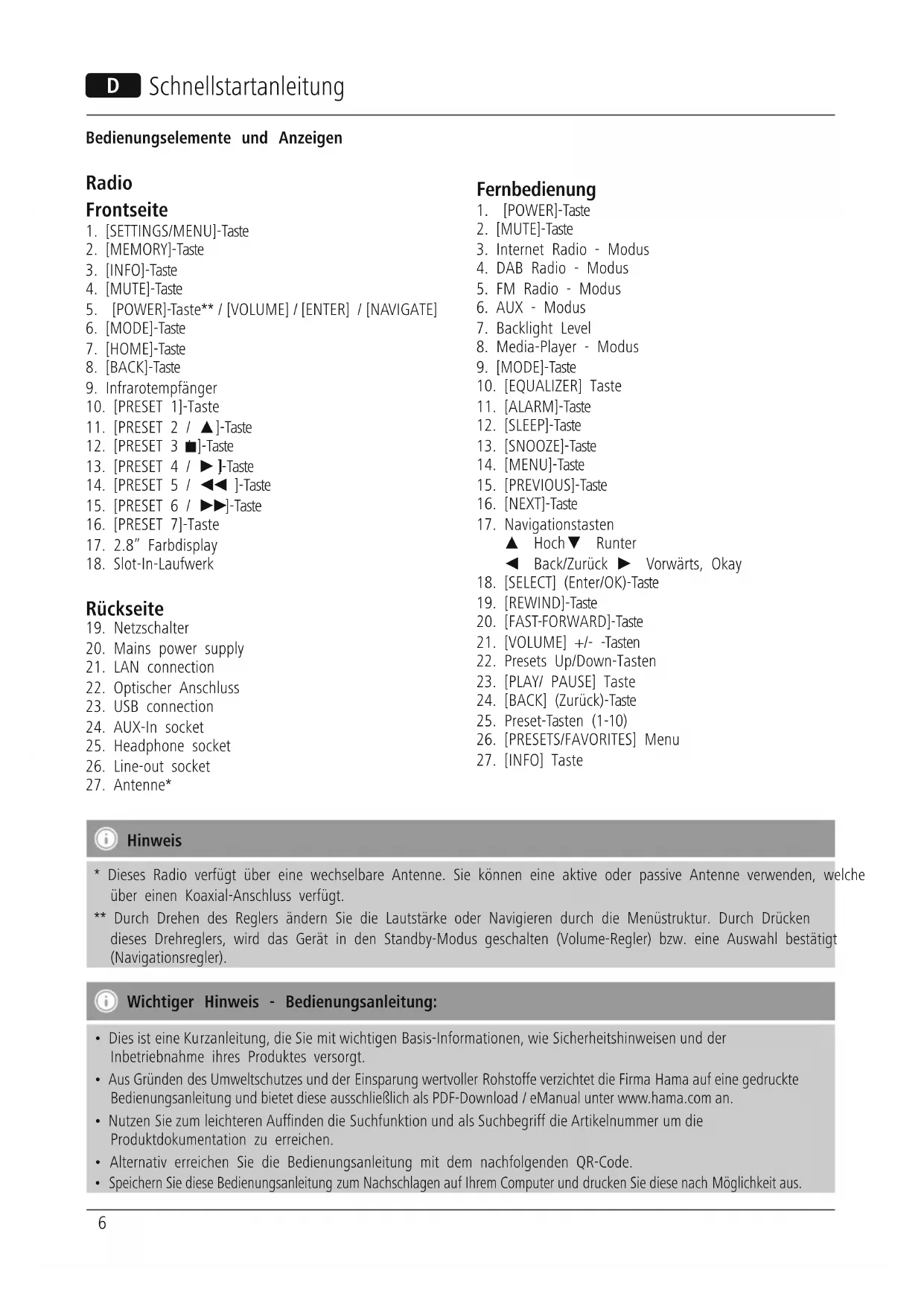 - Aus Gründen des Umweltschutzes und der Einsparung wertvoller Rohstoffe verzichtet die Firma Hama auf eine gedruckte Bedienungsanleitung und bietet diese ausschließlich als PDF-Download / eManual unter www.hama.com an.
