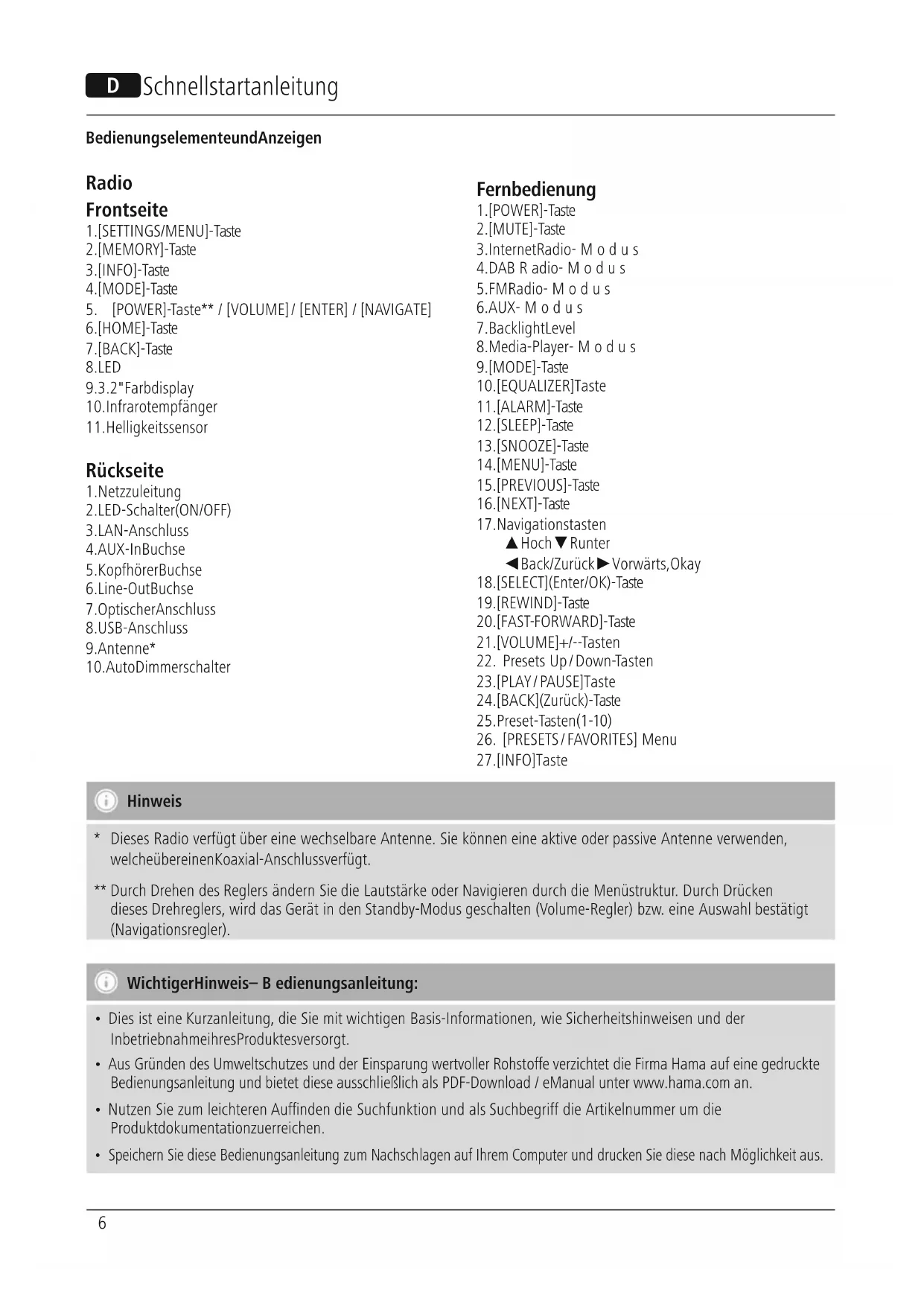 Hinweis *Dieses Radio verfügt über eine wechselbareAntenne. Sie können eine aktive oder passive Antenne verwenden, welche über einen Koaxial-Anschluss verfügt. ** Durch Drehen des Reglers ändern Sie die Lautstärke oder Navigieren durch die Menüstruktur.Durch Drücken dieses Drehreglers, wirddas Gerät in den Standby-Modus geschalten (Volume-Regler) bzw.eine Auswahl bestätigt (Navigationsregler). Wichtiger Hinweis –Bedienungsanleitung: