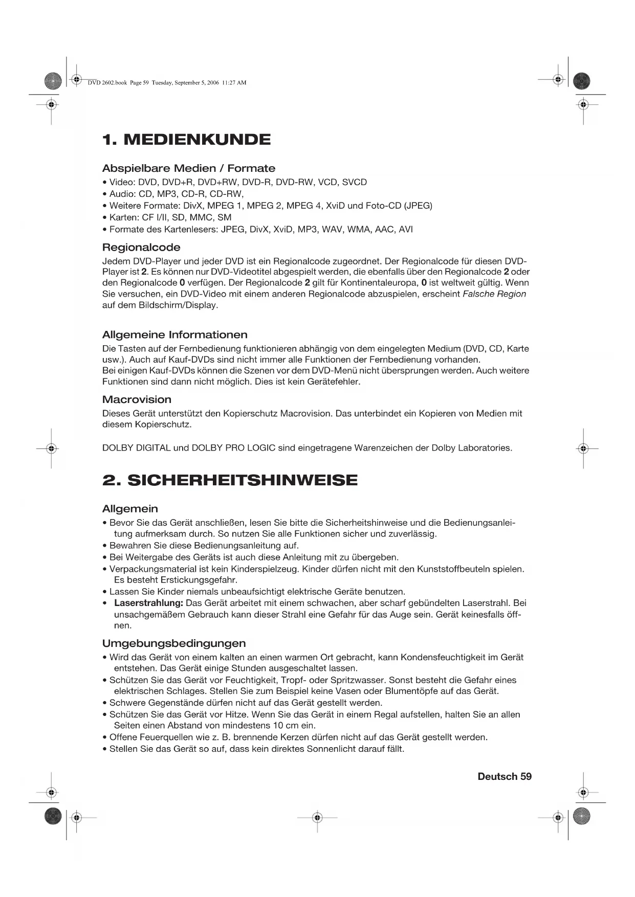 - Stellen Sie das Gerät so auf, dass kein direktes Sonnenlicht darauf fällt. DVD 2602.book Page 59 Tuesday, September 5, 2006 11:27 AM60 Deutsch Stromversorgung