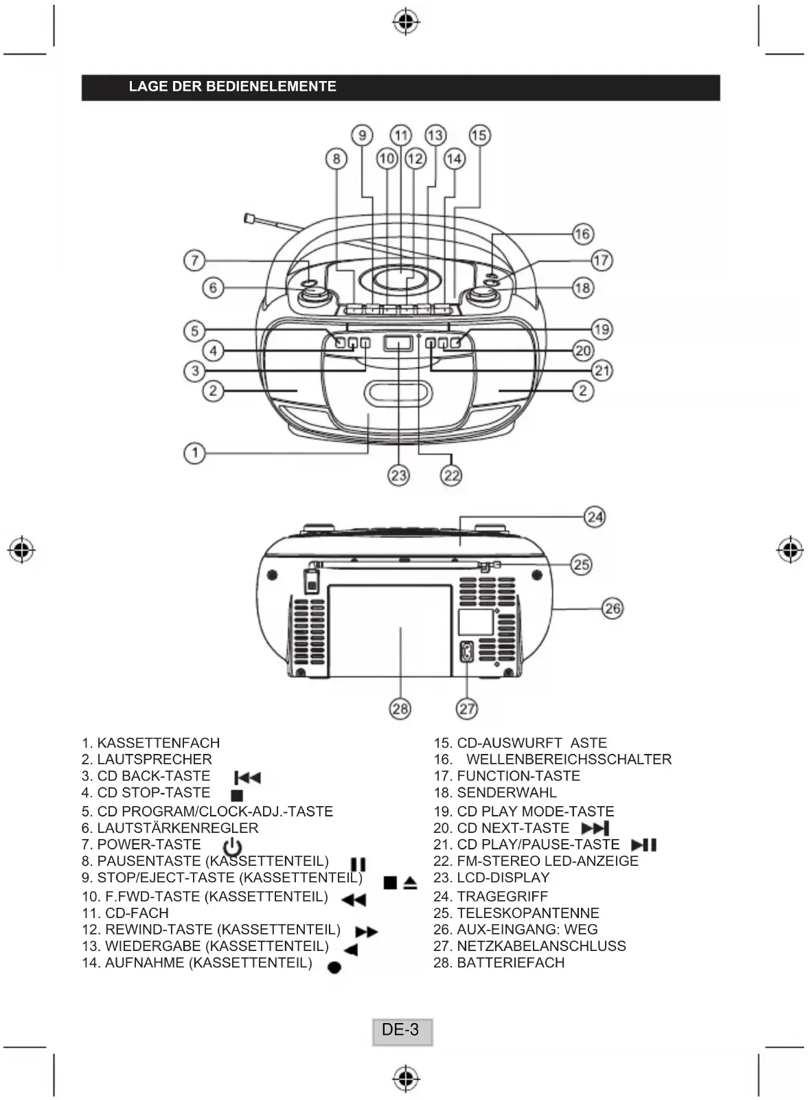 DE-8CD-TEIL Kanäle: 2 Kanäle Signal-Rausch-Verhältnis: 60 dB Gleichlaufschwankungen: nicht feststellbar Abtastfrequenz: 44,1 kHz 8-faches Oversampling Quantisierung: 1 bit DA-Converter Lichtquelle: Halbleiterlaser Laser-Wellenlänge 790 nm RADIOTEIL Frequenzbereiche: FM 87.5 - 108 MHz AM 522 - 1620 kHz Antennen: AM: Eingebauter Ferritstab FM: Wurfantenne ALLGEMEINES Ausgangsleistung: 1.2 W + 1.2 W (RMS) Leistungsaufnahme: 9,5 W AUX IN-Eingang 3,5 mm Lautsprecher: 3 " 8 OHM Stromversorgung: W echselstrom: 230V ~ 50Hz Gleichstrom: 9V ( 6 x 1.5V LR14/ "C"/UM2 ) Abmessungen: 294(L) x 206(T) x 153(H)mm Gewicht 1.72 KG Aufgrund der fortschreitenden technischen Entwicklungen können sich die Funktionen und das Design ohne jegliche Vorankündigung ändern. Aufstellung des Gerätes: Mobiliar ist heutzutage oft mit einer Vielzahl von Lacken und Synthetikbelägen beschichtet, die mit einer Vielzahl von Reinigungsprodukten behandelt werden müssen. Es ist daher nicht völlig auszuschließen, dass einige dieser Substanzen Bestandteile enthalten, die die Gummi-Standfüße des Gerätes angreifen und weich machen. Auch können die Gummi-Standfüße des Gerätes Verfärbungen an den Möbeln verursachen.SetzenSiedasGerätggf.aufeinerutschfesteOberäche. TECHNISCHE DATEN KASSETTENTEIL Spurenformat: 2-Spur-Stereo Aufnahmesystem: AC bias Löschkopf: Magnetischer Löschkopf, 6-polig Bandgeschwindigkeit: 4.75 cm / Sek. F.F . & REW-Zeit: 170 Sek. (F-60 Kassetten) Frequenzbereich: 125 Hz - 8000 Hz (Normalband) Bitte entsorgen Sie elektrische und elektronische Geräte nicht in den Hausmüll.