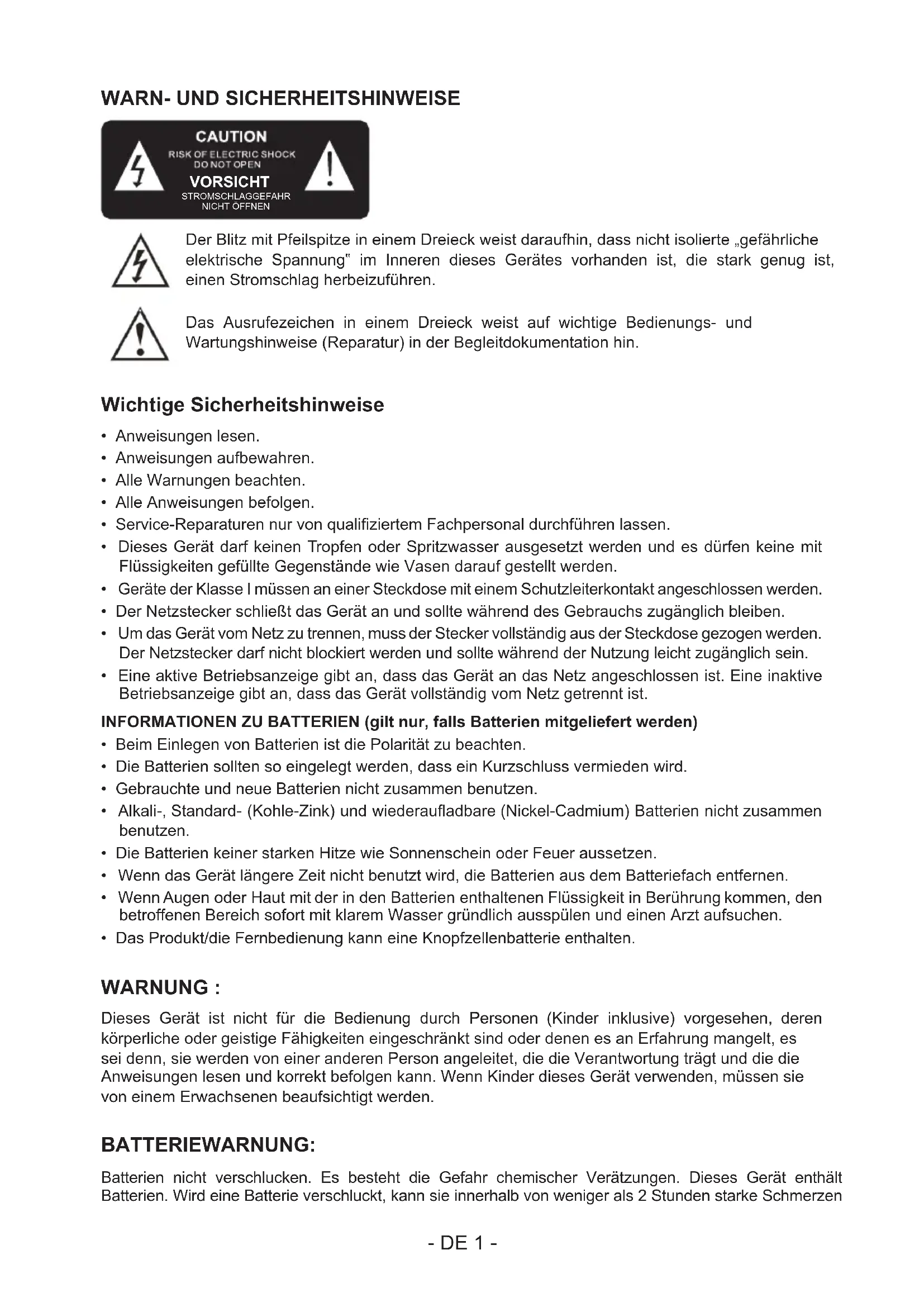 - Das Produkt/die Fernbedienung kann eine Knopfzellenbatterie enthalten. WARNUNG : Dieses Gerät ist nicht für die Bedienung durch Personen (Kinder inklusive) vorgesehen, deren körperliche oder geistige Fähigkeiten eingeschränkt sind oder denen es an Erfahrung mangelt, es sei denn, sie werden von einer anderen Person angeleitet, die die Verantwortung trägt und die die Anweisungen lesen und korrekt befolgen kann. Wenn Kinder dieses Gerät verwenden, müssen sie von einem Erwachsenen beaufsichtigt werden. BATTERIEWARNUNG: Batterien nicht verschlucken. Es besteht die Gefahr chemischer Verätzungen. Dieses Gerät enthält Batterien. Wird eine Batterie verschluckt, kann sie innerhalb von weniger als 2 Stunden starke Schmerzen- DE 2 - im innern verursachen und zum Tode führen. Alte und neue Batterien immer von Kindern und schwachen Personen fern halten. Falls das Batteriefach nicht korrekt geschlossen werden kann, darf das Gerät nicht weiter benutzt werden. Bei Verschlucken einer Batterie bitte sofort einen Arzt aufsuchen. WICHTIGE ANMERKUNGEN: Werden die Batterien fehlerhaft gewechselt oder bleiben die Batterien in einem Gerät, das längere Zeit nicht benutzt wird, besteht Explosionsgefahr. Alte Batterien stets durch identische oder gleichwertige Ausführungen ersetzen. doppelte Isolierung Gleichstrom Wechselstrom Symbol für den Gebrauch in Gebäuden Umweltschutz Das Produkt wurde mit qualitativ hochwertigen Werkstoffen und Komponenten konzipiert und hergestellt, die recycelt und wiederverwendet werden können. Ihr Produkt enthält Batterien, für die die europäische Richtlinie 2006/66/EG gilt und die nicht mit den normalen Haushaltsabfällen entsorgt werden dürfen. Bitte informieren Sie sich über die örtlichen Vorschriften bezüglich der getrennten Sammlung von Batterien, da eine ordnungsgemäße Entsorgung dazu beiträgt, Umweltschäden zu verhindern und Ihre Gesundheit zu schützen. Dieses Symbol einer durchgestrichenen Mülltonne auf Rädern auf einem Produkt weist daraufhin, dass für das Produkt die europäische Richtlinie 2002/96/EG gilt. Bitte informieren Sie sich über das örtliche Abfalltrennsystem für elektrische und elektronische Produkte. Bitte richten Sie sich nach den in Ihrer Region geltenden Vorschriften für die Abfalltrennung und entsorgen Sie Ihre alten Produkte nicht mit Ihren normalen Haushaltsabfällen. Die Entsorgung alter Produkte hilft, Umweltschäden zu verhindern und Ihre Gesundheit zu schützen. Konformität Dieses Produkt erfüllt die Funkstörungsanforderungen der Europäischen Gemeinschaft. Dieses Gerät ist mit diesem Etikett versehen.- DE 3 - Batterie-/Akkuleistung: