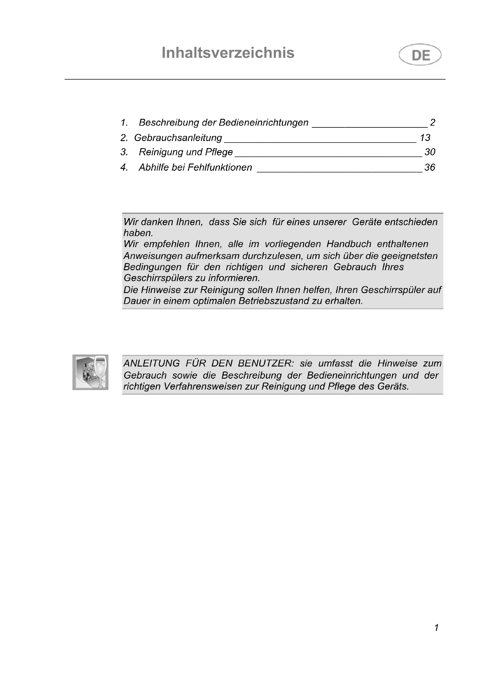 Wir danken Ihnen, dass Sie sich für eines unserer Geräte entschieden haben. Wir empfehlen Ihnen, alle im vorliegenden Handbuch enthaltenen Anweisungen aufmerksam durchzulesen, um sich über die geeignetsten Bedingungen für den richtigen und sicheren Gebrauch Ihres Geschirrspülers zu informieren. Die Hinweise zur Reinigung sollen Ihnen helfen, Ihren Geschirrspüler auf Dauer in einem optimalen Betriebszustand zu erhalten.