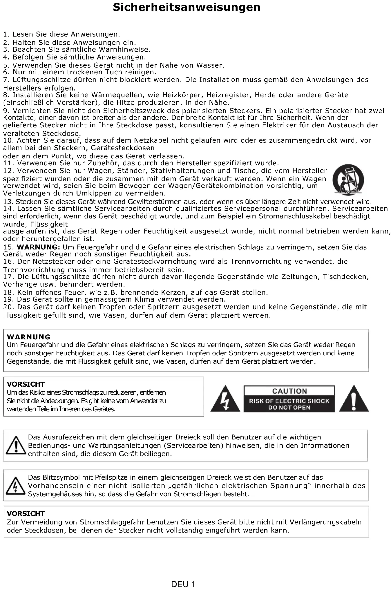 Das Ausrufezeichen mit dem gleichseitigen Dreieck soll den Benutzer auf die wichtigen Bedienungs- und Wartungsanleitungen (Servicearbeiten) hinweisen, die in den Informationen enthalten sind, die diesem Gerät beiliegen. Das Blitzsymbol mit Pfeilspitze in einem gleichseitigen Dreieck weist den Benutzer auf das Vorhandensein einer nicht isolierten „gefährlichen elektrischen Spannung“ innerhalb des Systemgehäuses hin, so dass die Gefahr von Stromschlägen besteht. VORSICHT Zur Vermeidung von Stromschlaggefahr benutzen Sie dieses Gerät bitte nicht mit Verlängerungskabeln oder Steckdosen, bei denen der Stecker nicht vollständig eingeführt werden kann. WARNUNG Um Feuergefahr und die Gefahr eines elektrischen Schlags zu verringern, setzen Sie das Gerät wede r Regen no ch son st iger Feu cht igkeit aus . D as Gerät darf keinen Tropfen oder Spritzern ausgesetzt werden und keine Gegenstände, die mit Flüssigkeit gefüllt sind, wie Vasen, dürfen auf dem Gerät platzie rt werden. VORSICHT Um das Risiko eines Stromschlags zu reduzieren, entfernen Sie nicht die Abdeckungen. Es gibt keine vom Anwender zu wartenden Teile im Inneren des Gerätes. Lassen Sie Servicearbeiten nur durch qualifiziertesA. Zubehö r und Treiberinstallation