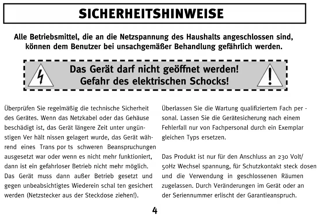 ONE (der aktuelle Titel wird wiederholt), FOLD (ein ganzer Datenordner wird wiederholt), ALL (alle Musik-Daten auf dem Speichermedium werden wiederholt), RAN (die Titel werden zufällig wiedergegeben).16 Kopfhörer TYPISCHE ANSCHLUSSVARIANTEN Bitte beachten Sie beim Anschluss von 4 Lautsprecherboxen, dass diese eine Impedanz zwischen 8 und 16 Ohm besitzen müssen! Die Verwendung niedrigerer Impedanzen führt, in der Einstellung A/B (beide Boxenpaare aktiv), zur Beschädigung des Verstärkers! SD/USB17 Analoger Audio Ausgang des Computers Quellgerät Lautsprecher IiIIiIIi L R TYPISCHE ANSCHLUSSVARIANTEN Smartphone oder Tablet Verstärker, Endstufe oder Aktiv-Subwoofer IIIIIIII L R18 Stellen Sie die Kabelverbindung in der nachfolgend genannten Reihenfolge her. Nehmen Sie niemals Än de rungen an den Kabelverbindungen vor, wäh- rend die Geräte eingeschaltet sind! Als Steck ver - binder für Ein- und Ausgänge sind mechanisch iden- tische Cinch-Buchsen vorhanden, achten Sie darauf, dass Sie diese Anschlüsse bei der Installation nicht verwechseln! Achten Sie ebenfalls darauf, die analo- gen Eingänge für rechts und links nicht zu vertau- schen. Häufig sind deren Cinch-Anschlüsse folgen- dermaßen farblich markiert: rot für den rechten Kanal, schwarz oder weiß für den linken Kanal. Achten Sie darauf, dass alle Steckverbindungen fest - sitzen. Unzureichende Anschlüsse können Stör ge - räusche, Ausfälle und Fehlfunktionen verursachen. Anschluss der Quellgeräte Es können bis zu zwei Stereo-Quellen mit Cinch- Hochpegelausgang an die Stereo Cinch-Eingänge „INPUT“ (18/19) angeschlossen werden. Verwenden Sie handelsübliche Cinch-Kabel. Oft sind die Aus - gangs anschlüsse der Quellgeräte mit „LINE OUT“ beschriftet. Bei beiden analogen Eingangs an- schlüssen (AUX1, AUX2) dieses Verstärkers handelt es sich um elektrisch gleichwertige Hochpegel ein - gänge mit Cinch-Buchsen. Stellen Sie für USB/SD/ BT bzw. Tuner den Eingangswahlschalter auf AUX3. Sie können dann digitale Speichermedien an die dafür vorgesehenen Eingänge „SD“ (3) und „USB“ (4) einstecken und abspielen. Ziehen Sie die Speicher medien nie während des Betriebs ab! Dies kann zum Verlust von Daten führen. Um die BT- oder FM-Tuner Funktion zu nutzen, betätigen Sie die Taste “MODE” am Gerät oder an der Fern be die -