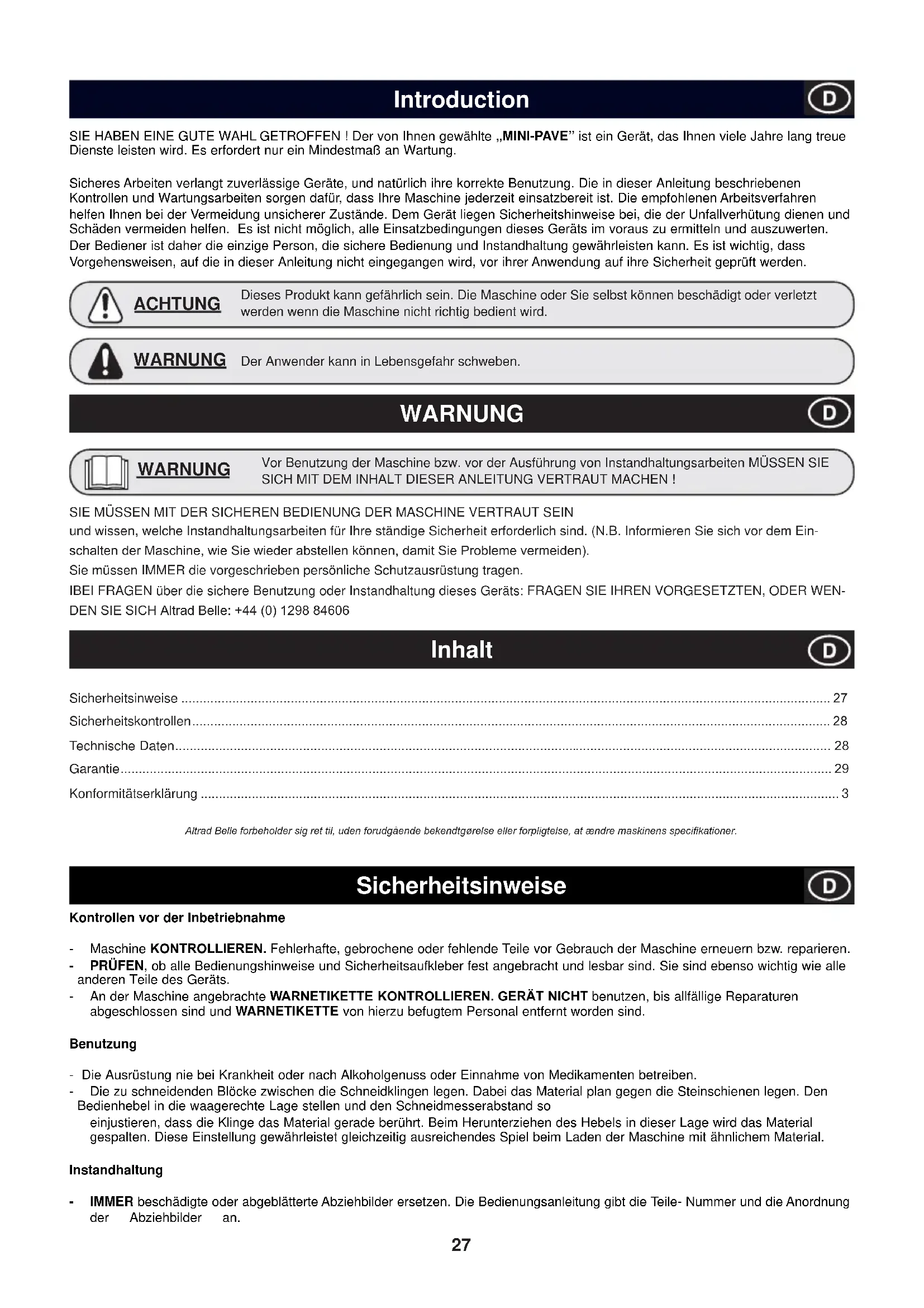 for at få adgang til registreringssiden. Garanti27 Introduction SIE HABEN EINE GUTE WAHL GETROFFEN ! Der von Ihnen gewählte „MINI-PAVE” ist ein Gerät, das Ihnen viele Jahre lang treue Dienste leisten wird. Es erfordert nur ein Mindestmaß an Wartung. Sicheres Arbeiten verlangt zuverlässige Geräte, und natürlich ihre korrekte Benutzung. Die in dieser Anleitung beschriebenen Kontrollen und Wartungsarbeiten sorgen dafür, dass Ihre Maschine jederzeit einsatzbereit ist. Die empfohlenen Arbeitsverfahren helfen Ihnen bei der Vermeidung unsicherer Zustände. Dem Gerät liegen Sicherheitshinweise bei, die der Unfallverhütung dienen und Schäden vermeiden helfen. Es ist nicht möglich, alle Einsatzbedingungen dieses Geräts im voraus zu ermitteln und auszuwerten. Der Bediener ist daher die einzige Person, die sichere Bedienung und Instandhaltung gewährleisten kann. Es ist wichtig, dass Vorgehensweisen, auf die in dieser Anleitung nicht eingegangen wird, vor ihrer Anwendung auf ihre Sicherheit geprüft werden. Sicherheitsinweise .................................................................................................................................................................................. Sicherheitskontrollen ............................................................................................................................................................................... Technische Daten .................................................................................................................................................................................... Garantie ................................................................................................................................................................................................... Konformitätserklärung ............................................................................................................................................................................... 3 $OWUDG%HOOHIRUEHKROGHUVLJUHWWLOXGHQIRUXGJnHQGHEHNHQGWJ¡UHOVHHOOHUIRUSOLJWHOVHDWQGUHPDVNLQHQVVSHFL¿NDWLRQHU Sicherheitsinweise Kontrollen vor der Inbetriebnahme - Maschine .21752//,(5(1Fehlerhafte, gebrochene oder fehlende Teile vor Gebrauch der Maschine erneuern bzw. reparieren. - PRÜFEN, ob alle Bedienungshinweise und Sicherheitsaufkleber fest angebracht und lesbar sind. Sie sind ebenso wichtig wie alle anderen Teile des Geräts. - An der Maschine angebrachte :$51(7,.(77(.21752//,(5(1*(5b71,&+7benutzen, bis allfällige Reparaturen abgeschlossen sind und WARNETIKETTE von hierzu befugtem Personal entfernt worden sind. Benutzung - Die Ausrüstung nie bei Krankheit oder nach Alkoholgenuss oder Einnahme von Medikamenten betreiben. - Die zu schneidenden Blöcke zwischen die Schneidklingen legen. Dabei das Material plan gegen die Steinschienen legen. Den Bedienhebel in die waagerechte Lage stellen und den Schneidmesserabstand so einjustieren, dass die Klinge das Material gerade berührt. Beim Herunterziehen des Hebels in dieser Lage wird das Material gespalten. Diese Einstellung gewährleistet gleichzeitig ausreichendes Spiel beim Laden der Maschine mit ähnlichem Material. Instandhaltung - IMMER beschädigte oder abgeblätterte Abziehbilder ersetzen. Die Bedienungsanleitung gibt die Teile- Nummer und die Anordnung der Abziehbilder an. Der Anwender kann in Lebensgefahr schweben. WARNUNG Dieses Produkt kann gefährlich sein. Die Maschine oder Sie selbst können beschädigt oder verletzt werden wenn die Maschine nicht richtig bedient wird. ACHTUNG WARNUNG Inhalt SIE MÜSSEN MIT DER SICHEREN BEDIENUNG DER MASCHINE VERTRAUT SEIN und wissen, welche Instandhaltungsarbeiten für Ihre ständige Sicherheit erforderlich sind. (N.B. Informieren Sie sich vor dem Ein-