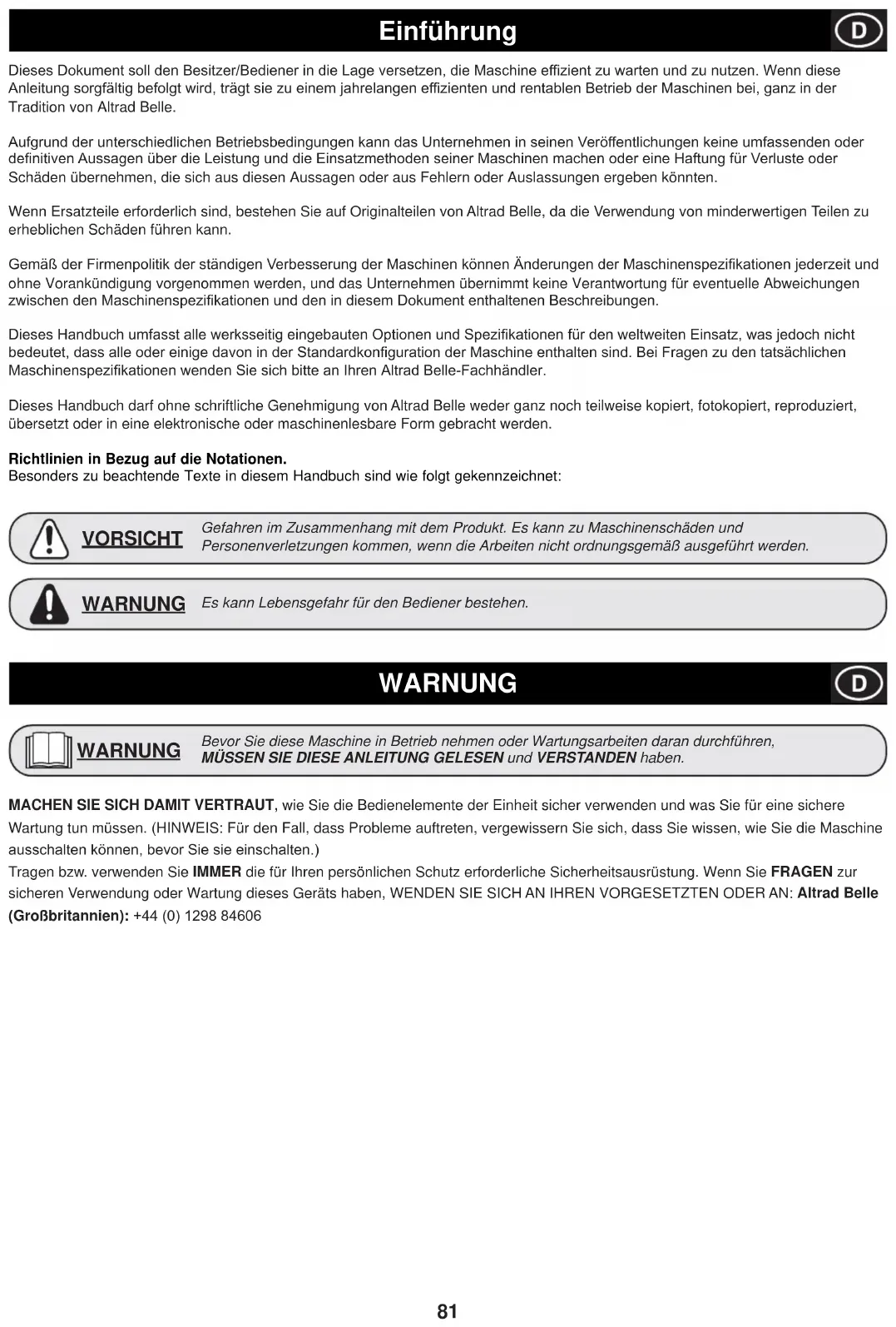 WARNUNG ALLGEMEINE SICHERHEIT Zu Ihrem eigenen Schutz und zur Sicherheit der Menschen in Ihrer Umgebung lesen Sie bitte die folgenden Sicherheitshinweise und stellen Sie sicher, dass Sie sie vollständig verstehen. Es liegt in der Verantwortung der Bediener, sicherzustellen, dass sie die sichere Bedienung dieses Geräts vollständig verstanden haben. Wenn Sie sich hinsichtlich der sicheren und korrekten Verwendung der Maschine nicht sicher sind, wenden Sie sich an Ihren Vorgesetzten oder an Altrad Belle. Diese Maschine wurde so konstruiert, dass mögliche Risiken durch ihre Verwendung eliminiert wurden. Es bestehen jedoch Restrisiken, die nicht eindeutig erkennbar sind und zu Personen- oder Sachschäden und möglicherweise zum Tod führen können. Wenn solche unvorhersehbaren und nicht erkennbaren Risiken ersichtlich werden, muss die Maschine sofort stillgelegt werden, und der Bediener oder sein Vorgesetzter muss geeignete Maßnahmen ergreifen, um diese Risiken zu beseitigen. In manchen Fällen muss der Hersteller über ein solches Ereignis informiert werden, um Gegenmaßnahmen für die Zukunft zu ergreifen. Bewahren Sie IMMER die Bedienungsanleitung und alle anderen Handbücher, die zu dieser Maschine gehören, auf. Ersetzen Sie verloren gegangene oder unleserlich gewordene Handbücher unverzüglich.