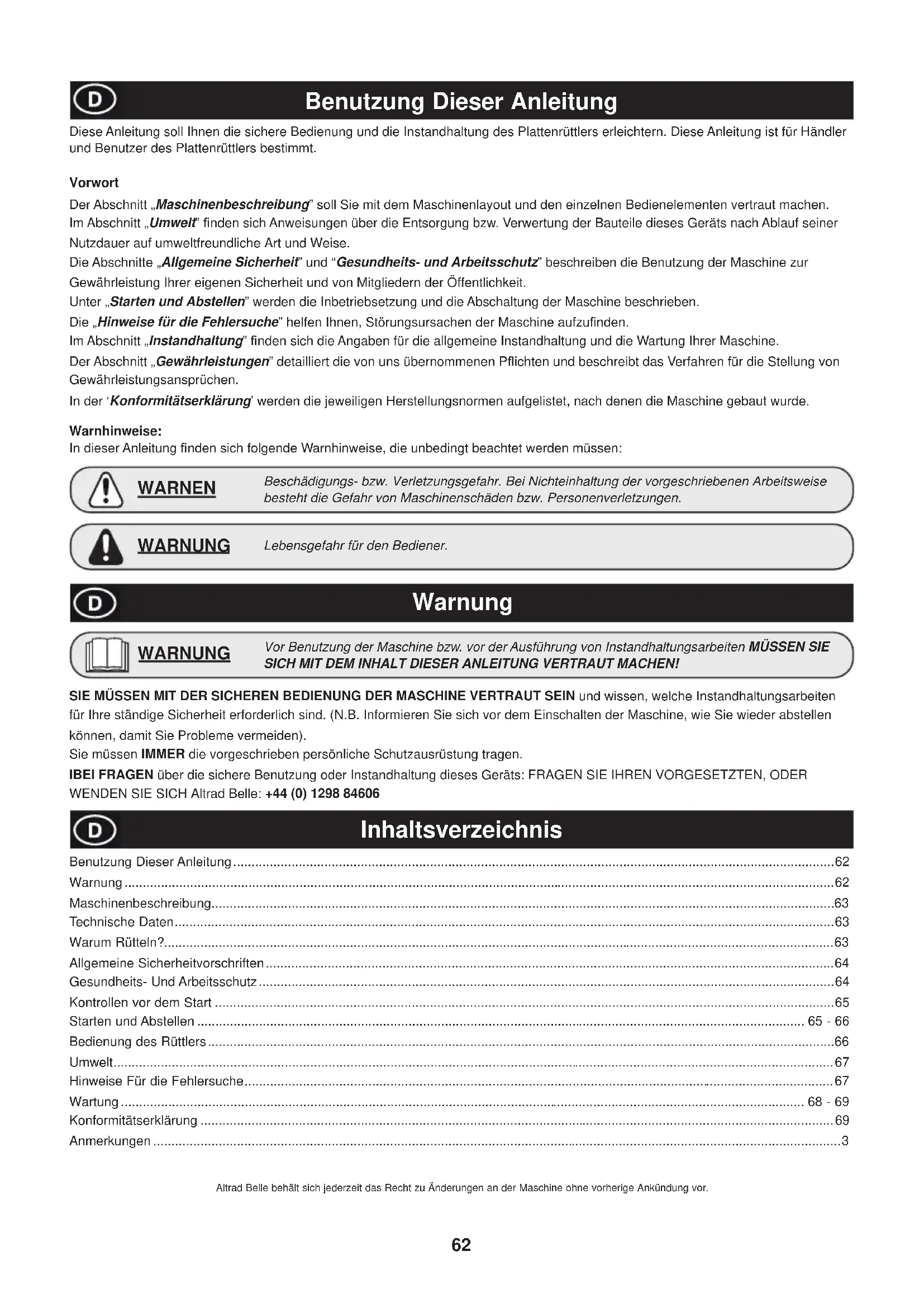 - Motortændrør ALTRAD Belle og/eller deres udnævnte agenter, direktører, ansatte eller forsikringsgiver kan ikke holdes ansvarlig for følgeskader eller anden skade, tab eller udgifter i forbindelse med eller som følge af eller manglende mulighed for at bruge maskinen til noget formål. Garantikrav Alle garantikrav bør først anmeldes til ALTRAD Belle enten per telefon, per fax, per E-mail eller per brev. Tel: +44 (0)1298 84606 Fax: +44 (0)1298 84073 E-mail : Warranty@belle-group.co.uk For garantikrav ALTRAD Belle Warranty Department, Sheen, Nr. Buxton Derbyshire SK17 0EU England Garantiregistrering: Som led i vores bestræbelser på at gøre ALTRAD Belle grønnere og mere miljøvenligt har vi indført garantiregistrering online. For at gå til registreringssiden på vores webside bedes du bruge følgende adresse: http://www.bellegroup.com/index.php?p=warranty_registration Alternativt bedes du skanne QR-koden (Quick Response Code) ved siden af denne tekst med din smartphone for at få adgang til registreringssiden.62 Inhaltsverzeichnis Benutzung Dieser Anleitung Diese Anleitung soll Ihnen die sichere Bedienung und die Instandhaltung des Plattenrüttlers erleichtern. Diese Anleitung ist für Händler und Benutzer des Plattenrüttlers bestimmt. Vorwort Der Abschnitt „Maschinenbeschreibung” soll Sie mit dem Maschinenlayout und den einzelnen Bedienelementen vertraut machen. Im Abschnitt „Umwelt” ¿ nden sich Anweisungen über die Entsorgung bzw. Verwertung der Bauteile dieses Geräts nach Ablauf seiner Nutzdauer auf umweltfreundliche Art und Weise. Die Abschnitte „Allgemeine Sicherheit” und “Gesundheits- und Arbeitsschutz” beschreiben die Benutzung der Maschine zur Gewährleistung Ihrer eigenen Sicherheit und von Mitgliedern der Öffentlichkeit. Unter „Starten und Abstellen” werden die Inbetriebsetzung und die Abschaltung der Maschine beschrieben. Die „Hinweise für die Fehlersuche” helfen Ihnen, Störungsursachen der Maschine aufzu¿ nden. Im Abschnitt „Instandhaltung” ¿ nden sich die Angaben für die allgemeine Instandhaltung und die Wartung Ihrer Maschine. Der Abschnitt „Gewährleistungen” detailliert die von uns übernommenen PÀ ichten und beschreibt das Verfahren für die Stellung von Gewährleistungsansprüchen. In der ‘Konformitätserklärung’ werden die jeweiligen Herstellungsnormen aufgelistet, nach denen die Maschine gebaut wurde. Warnhinweise: In dieser Anleitung ¿ nden sich folgende Warnhinweise, die unbedingt beachtet werden müssen: Beschädigungs- bzw. Verletzungsgefahr. Bei Nichteinhaltung der vorgeschriebenen Arbeitsweise besteht die Gefahr von Maschinenschäden bzw. Personenverletzungen. WARNEN Lebensgefahr für den Bediener. WARNUNG Warnung SIE MÜSSEN MIT DER SICHEREN BEDIENUNG DER MASCHINE VERTRAUT SEIN und wissen, welche Instandhaltungsarbeiten für Ihre ständige Sicherheit erforderlich sind. (N.B. Informieren Sie sich vor dem Einschalten der Maschine, wie Sie wieder abstellen können, damit Sie Probleme vermeiden). Sie müssen IMMER die vorgeschrieben persönliche Schutzausrüstung tragen. IBEI FRAGEN über die sichere Benutzung oder Instandhaltung dieses Geräts: FRAGEN SIE IHREN VORGESETZTEN, ODER WENDEN SIE SICH Altrad Belle: +44 (0) 1298 84606 Vor Benutzung der Maschine bzw. vor der Ausführung von Instandhaltungsarbeiten MÜSSEN SIE SICH MIT DEM INHALT DIESER ANLEITUNG VERTRAUT MACHEN! WARNUNG Benutzung Dieser Anleitung .....................................................................................................................................................................62 Warnung ...................................................................................................................................................................................................62 Maschinenbeschreibung...........................................................................................................................................................................63 Technische Daten .....................................................................................................................................................................................63 Warum Rütteln? ........................................................................................................................................................................................63 Allgemeine Sicherheitvorschriften ............................................................................................................................................................64 Gesundheits- Und Arbeitsschutz ..............................................................................................................................................................64 Kontrollen vor dem Start ..........................................................................................................................................................................65 Starten und Abstellen ....................................................................................................................................................................... 65 - 66 Bedienung des Rüttlers ............................................................................................................................................................................66 Umwelt ......................................................................................................................................................................................................67 Hinweise Für die Fehlersuche ..................................................................................................................................................................67 Wartung ........................................................................................................................................................................................