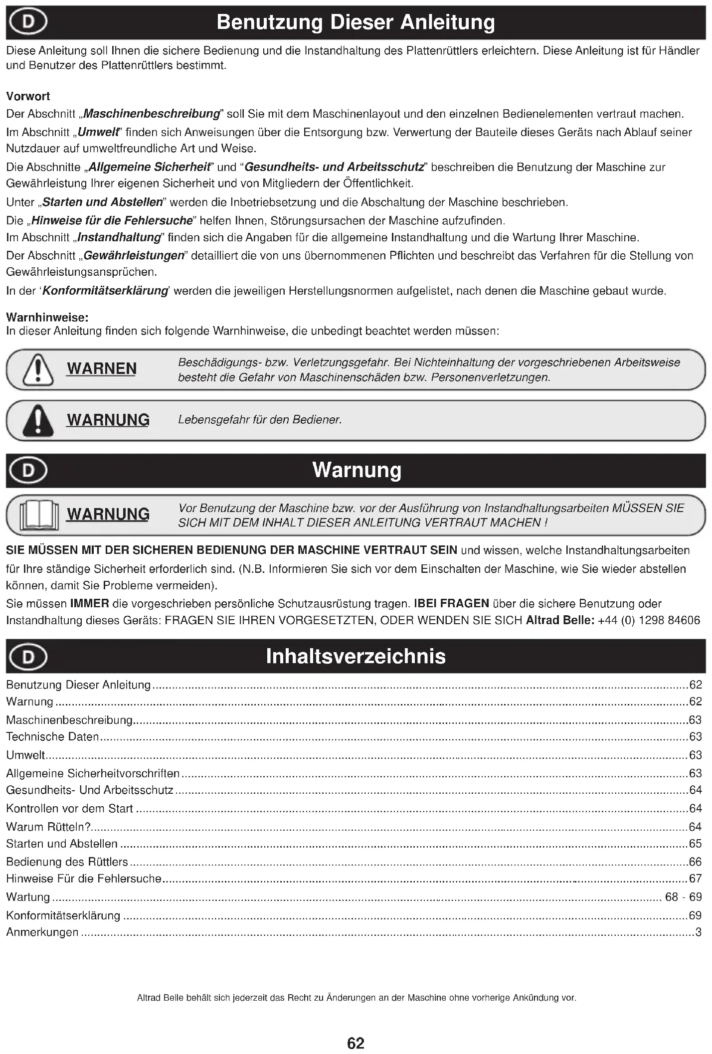 - Motortændrør Altrad Belle og/eller deres autoriserede forhandlere, direktører, medarbejdere eller forsikringsselskaber kan ikke holdes ansvarlige for følgeskader eller andre skader, tab eller udgifter i forbindelse med eller på grund af eller manglende evne til at anvende maskinen til noget formål. Garantikrav Alle garantikrav skal i første instans anmeldes til Altrad Belle, enten pr. telefon, fax, e-mail eller brev. Garantikrav skal anmeldes til: Altrad Belle Warranty Department, Sheen, Nr. Buxton Derbyshire SK17 0EU England Tel: +44 (0)1298 84606 Fax: +44 (0)1298 84722 Email : warranty@belle-group.co.uk I bak går styrehåndtagene parallelt med huset i brugerens retning. FORSIGTIG62 Inhaltsverzeichnis Benutzung Dieser Anleitung Diese Anleitung soll Ihnen die sichere Bedienung und die Instandhaltung des Plattenrüttlers erleichtern. Diese Anleitung ist für Händler und Benutzer des Plattenrüttlers bestimmt. Vorwort Der Abschnitt „Maschinenbeschreibung” soll Sie mit dem Maschinenlayout und den einzelnen Bedienelementen vertraut machen. Im Abschnitt „Umwelt” ¿ nden sich Anweisungen über die Entsorgung bzw. Verwertung der Bauteile dieses Geräts nach Ablauf seiner Nutzdauer auf umweltfreundliche Art und Weise. Die Abschnitte „Allgemeine Sicherheit” und “Gesundheits- und Arbeitsschutz” beschreiben die Benutzung der Maschine zur Gewährleistung Ihrer eigenen Sicherheit und von Mitgliedern der Öffentlichkeit. Unter „Starten und Abstellen” werden die Inbetriebsetzung und die Abschaltung der Maschine beschrieben. Die „Hinweise für die Fehlersuche” helfen Ihnen, Störungsursachen der Maschine aufzu¿ nden. Im Abschnitt „Instandhaltung” ¿ nden sich die Angaben für die allgemeine Instandhaltung und die Wartung Ihrer Maschine. Der Abschnitt „Gewährleistungen” detailliert die von uns übernommenen PÀ ichten und beschreibt das Verfahren für die Stellung von Gewährleistungsansprüchen. In der ‘Konformitätserklärung’ werden die jeweiligen Herstellungsnormen aufgelistet, nach denen die Maschine gebaut wurde. Warnhinweise: In dieser Anleitung ¿ nden sich folgende Warnhinweise, die unbedingt beachtet werden müssen: Beschädigungs- bzw. Verletzungsgefahr. Bei Nichteinhaltung der vorgeschriebenen Arbeitsweise besteht die Gefahr von Maschinenschäden bzw. Personenverletzungen. WARNEN Lebensgefahr für den Bediener. WARNUNG Warnung SIE MÜSSEN MIT DER SICHEREN BEDIENUNG DER MASCHINE VERTRAUT SEIN und wissen, welche Instandhaltungsarbeiten für Ihre ständige Sicherheit erforderlich sind. (N.B. Informieren Sie sich vor dem Einschalten der Maschine, wie Sie wieder abstellen können, damit Sie Probleme vermeiden). Sie müssen IMMER die vorgeschrieben persönliche Schutzausrüstung tragen. IBEI FRAGEN über die sichere Benutzung oder Instandhaltung dieses Geräts: FRAGEN SIE IHREN VORGESETZTEN, ODER WENDEN SIE SICH Altrad Belle: +44 (0) 1298 84606 Vor Benutzung der Maschine bzw. vor der Ausführung von Instandhaltungsarbeiten MÜSSEN SIE SICH MIT DEM INHALT DIESER ANLEITUNG VERTRAUT MACHEN ! WARNUNG Benutzung Dieser Anleitung .....................................................................................................................................................................62 Warnung ...................................................................................................................................................................................................62 Maschinenbeschreibung...........................................................................................................................................................................63 Technische Daten .....................................................................................................................................................................................63 Umwelt ......................................................................................................................................................................................................63 Allgemeine Sicherheitvorschriften ............................................................................................................................................................63 Gesundheits- Und Arbeitsschutz ..............................................................................................................................................................64 Kontrollen vor dem Start ..........................................................................................................................................................................64 Warum Rütteln? ........................................................................................................................................................................................64 Starten und Abstellen ...............................................................................................................................................................................65 Bedienung des Rüttlers ............................................................................................................................................................................66 Hinweise Für die Fehlersuche ..................................................................................................................................................................67 Wartung ............................................................................................................................................................................................ 68 - 69 Konformitätserklärung ..............................................................................................................................................................................69 Anmerkungen ...........................................................................................................