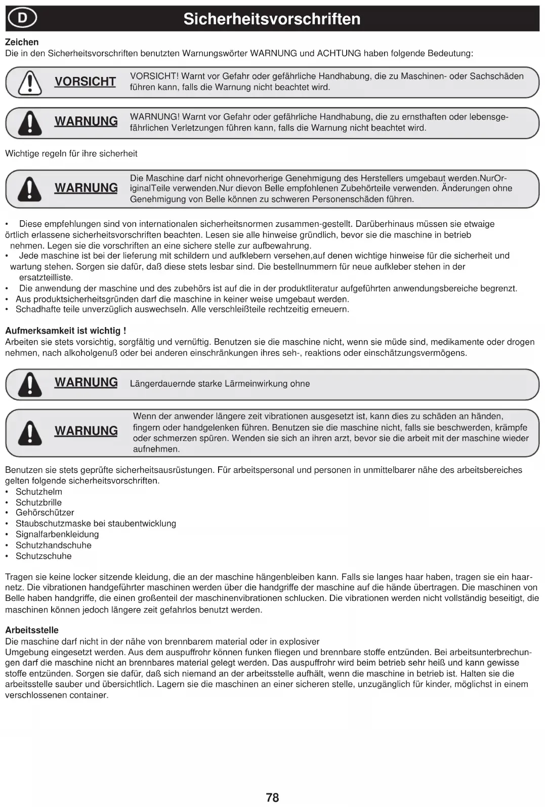 - Schadhafte teile unverzüglich auswechseln. Alle verschleißteile rechtzeitig erneuern. Aufmerksamkeit ist wichtig ! Arbeiten sie stets vorsichtig, sorgfältig und vernüftig. Benutzen sie die maschine nicht, wenn sie müde sind, medikamente oder drogen nehmen, nach alkoholgenuß oder bei anderen einschränkungen ihres seh-, reaktions oder einschätzungsvermögens. Zeichen Die in den Sicherheitsvorschriften benutzten Warnungswörter WARNUNG und ACHTUNG haben folgende Bedeutung: Wichtige regeln für ihre sicherheit Die Maschine darf nicht ohnevorherige Genehmigung des Herstellers umgebaut werden.NurOr- iginalTeile verwenden.Nur dievon Belle empfohlenen Zubehörteile verwenden. Änderungen ohne Genehmigung von Belle können zu schweren Personenschäden führen. WARNUNG WARNUNG! Warnt vor Gefahr oder gefährliche Handhabung, die zu ernsthaften oder lebensge- fährlichen Verletzungen führen kann, falls die Warnung nicht beachtet wird. WARNUNG Längerdauernde starke Lärmeinwirkung ohne WARNUNG VORSICHT! Warnt vor Gefahr oder gefährliche Handhabung, die zu Maschinen- oder Sachschäden führen kann, falls die Warnung nicht beachtet wird. VORSICHT Benutzen sie stets geprüfte sicherheitsausrüstungen. Für arbeitspersonal und personen in unmittelbarer nähe des arbeitsbereiches gelten folgende sicherheitsvorschriften.