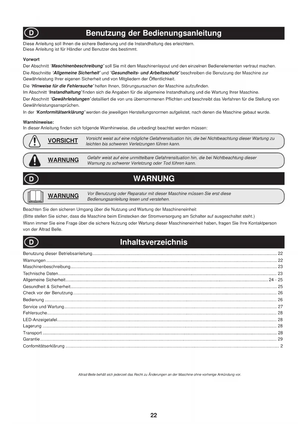 Lagerung Transport Stellen Sie beim Transport des Vibratech+ Motors sicher, das er nicht beschädigt wird, verrutscht, sich überschlägt oder aufprallt. Wenn Sie das Gerät für längere Zeit nicht benutzen, lagern Sie den Vibratech+ Motor in einer sauberen und trockenen und sicheren Umgebung.29 Garantie Dem Erstkäufer wird für den Altrad Belle Vibratech+ eine Garantie von einem Jahr (12 Monaten) ab ursprünglichem Kaufdatum angeboten. Die Garantie der Altrad Belle deckt Konstruktions-, Material- und Herstellungsfehler. Folgendes wird nicht von der Garantie der Altrad Belle gedeckt: