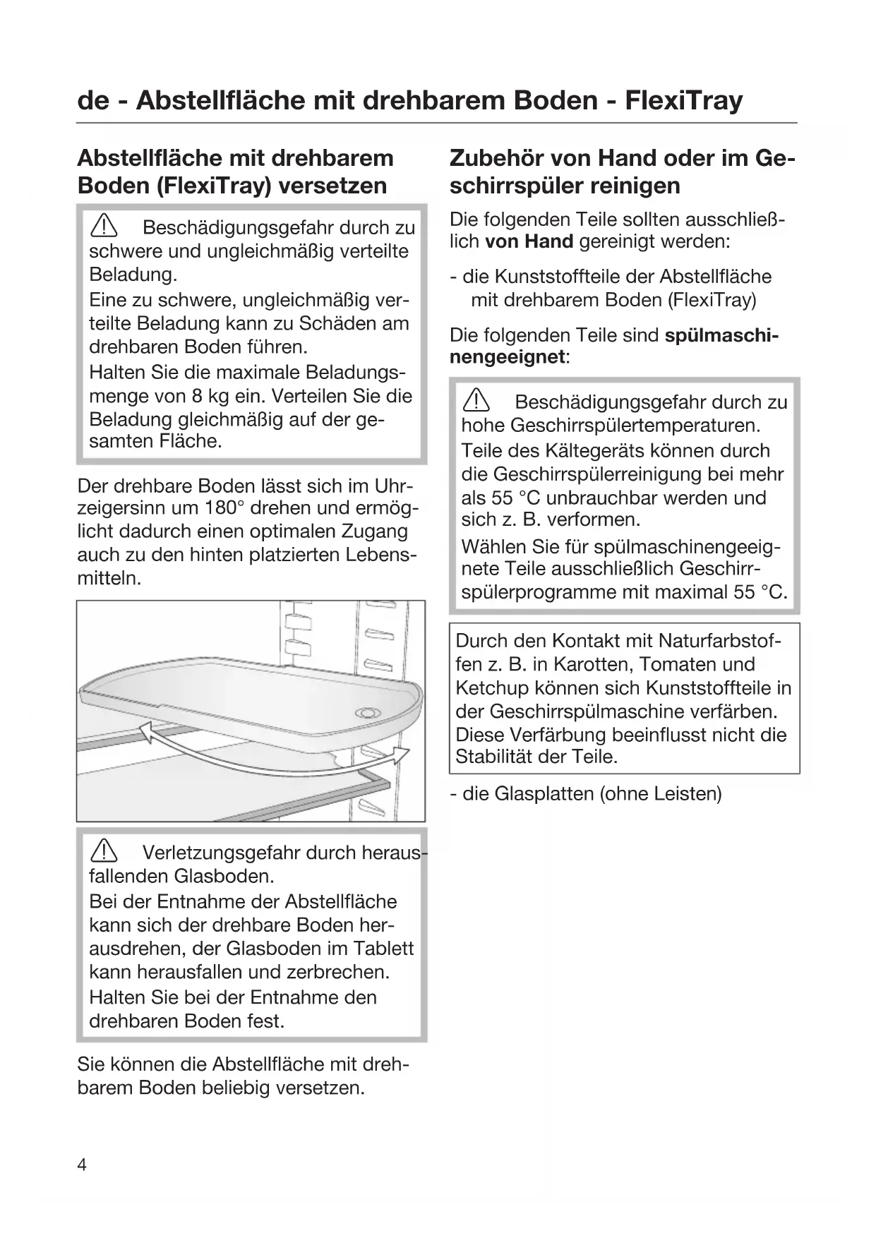 Abstellfläche mit drehbarem Boden (FlexiTray) versetzen Beschädigungsgefahr durch zu schwere und ungleichmäßig verteilte Beladung. Eine zu schwere, ungleichmäßig ver- teilte Beladung kann zu Schäden am drehbaren Boden führen. Halten Sie die maximale Beladungs- menge von 8kg ein. Verteilen Sie die Beladung gleichmäßig auf der ge- samten Fläche. Der drehbare Boden lässt sich im Uhr- zeigersinn um 180° drehen und ermög- licht dadurch einen optimalen Zugang auch zu den hinten platzierten Lebens- mitteln. Verletzungsgefahr durch heraus- fallenden Glasboden. Bei der Entnahme der Abstellfläche kann sich der drehbare Boden her- ausdrehen, der Glasboden im Tablett kann herausfallen und zerbrechen. Halten Sie bei der Entnahme den drehbaren Boden fest. Sie können die Abstellfläche mit dreh- barem Boden beliebig versetzen. Zubehör von Hand oder im Ge- schirrspüler reinigen Die folgenden Teile sollten ausschließ- lich von Hand gereinigt werden: - die Kunststoffteile der Abstellfläche mit drehbarem Boden (FlexiTray) Die folgenden Teile sind spülmaschi- nengeeignet: Beschädigungsgefahr durch zu hohe Geschirrspülertemperaturen. Teile des Kältegeräts können durch die Geschirrspülerreinigung bei mehr als 55°C unbrauchbar werden und sich z.B. verformen. Wählen Sie für spülmaschinengeeig- nete Teile ausschließlich Geschirr- spülerprogramme mit maximal 55°C. Durch den Kontakt mit Naturfarbstof- fen z.B. in Karotten, Tomaten und Ketchup können sich Kunststoffteile in der Geschirrspülmaschine verfärben. Diese Verfärbung beeinflusst nicht die Stabilität der Teile. - die Glasplatten (ohne Leisten)de - Abstellfläche mit drehbarem Boden - FlexiTray