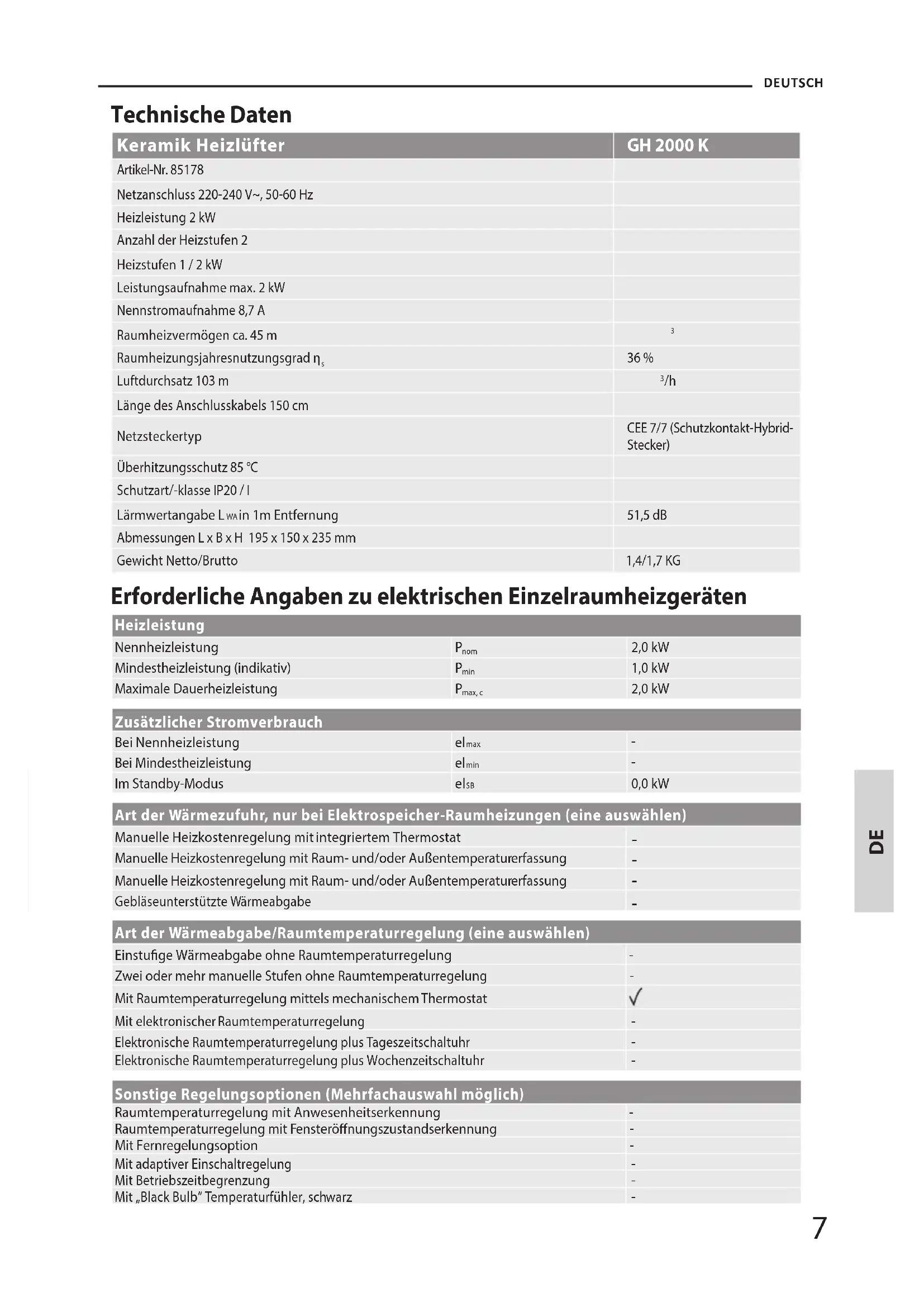 DEUTSCH Technische Daten Keramik Heizlüfter GH 2000 K Artikel-Nr. 85178Netzanschluss 220-240 V~, 50-60 HzHeizleistung 2 kWAnzahl der Heizstufen 2Heizstufen 1 / 2 kWLeistungsaufnahme max. 2 kWNennstromaufnahme 8,7 ARaumheizvermögen ca. 45 m Raumheizungsjahresnutzungsgrad η