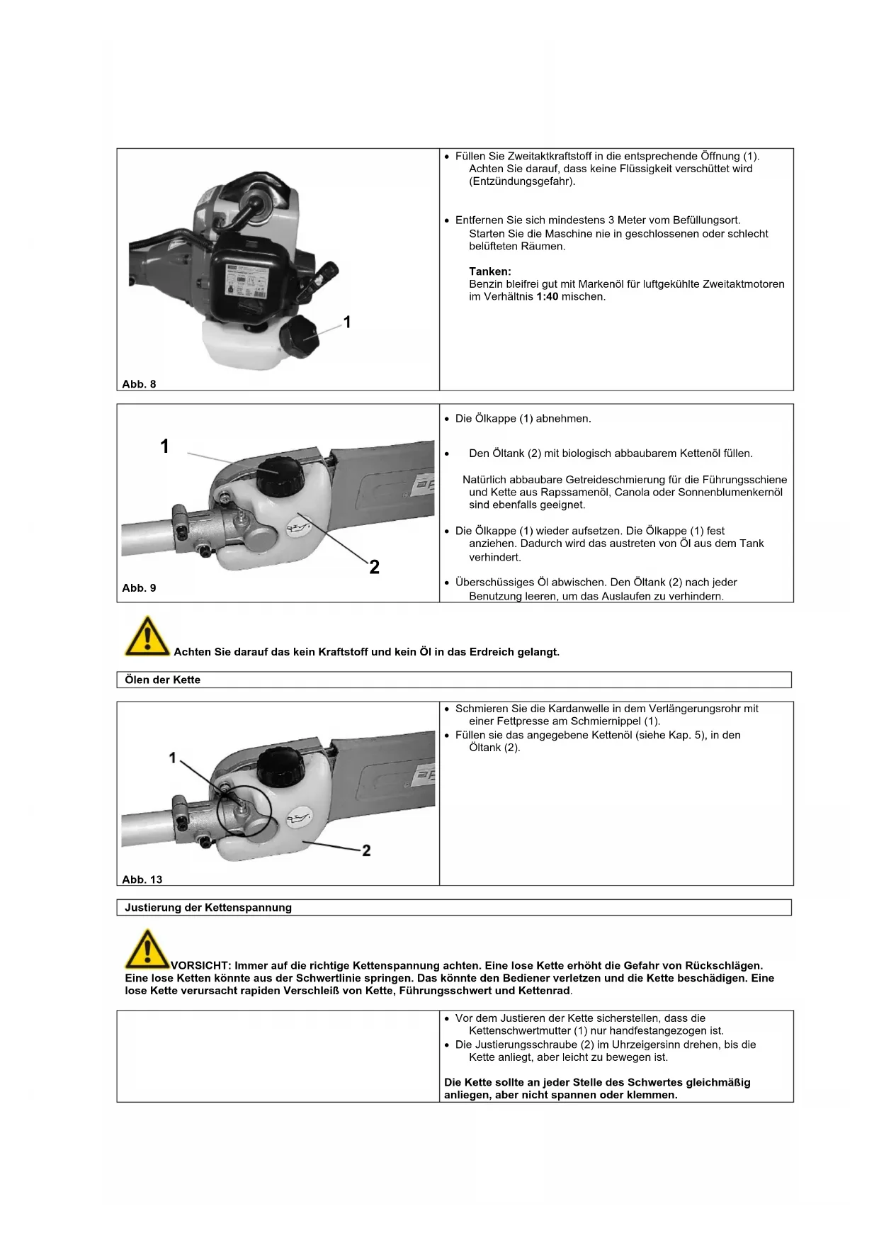 Abb. 9 Die Ölkappe (1) abnehmen. Den Öltank (2) mit biologisch abbaubarem Kettenöl füllen. Natürlich abbaubare Getreideschmierung für die Führungsschiene und Kette aus Rapssamenöl, Canola oder Sonnenblumenkernöl sind ebenfalls geeignet. Die Ölkappe (1) wieder aufsetzen. Die Ölkappe (1) fest anziehen. Dadurch wird das austreten von Öl aus dem Tank verhindert. Überschüssiges Öl abwischen. Den Öltank (2) nach jeder Benutzung leeren, um das Auslaufen zu verhindern. Achten Sie darauf das kein Kraftstoff und kein Öl in das Erdreich gelangt. Ölen der Kette Abb. 13 Schmieren Sie die Kardanwelle in dem Verlängerungsrohr mit einer Fettpresse am Schmiernippel (1). Füllen sie das angegebene Kettenöl (siehe Kap. 5), in den Öltank (2). Justierung der Kettenspannung VORSICHT: Immer auf die richtige Kettenspannung achten. Eine lose Kette erhöht die Gefahr von Rückschlägen. Eine lose Ketten könnte aus der Schwertlinie springen. Das könnte den Bediener verletzen und die Kette beschädigen. Eine lose Kette verursacht rapiden Verschleiß von Kette, Führungsschwert und Kettenrad. Vor dem Justieren der Kette sicherstellen, dass die Kettenschwertmutter (1) nur handfestangezogen ist. Die Justierungsschraube (2) im Uhrzeigersinn drehen, bis die Kette anliegt, aber leicht zu bewegen ist. Die Kette sollte an jeder Stelle des Schwertes gleichmäßig anliegen, aber nicht spannen oder klemmen.Abb. 11 Abb. 12 Die Kette sollte sich frei bewegen. Wenn sich die Kette nicht frei bewegt, diese durch Drehen der Justierungsschraube (2) gegen den Uhrzeigersinn lösen. Nachdem die Kettenspannung richtig ist, die Kettenschwertmuttern (1) festziehen. Dies erhöht die Gefahr von Rückschlägen und kann auch die Säge beschädigen. Hinweis: Eine neue Kette dehnt sich. Die neue Kette nach den ersten Betriebsminuten überprüfen. Die Kette abkühlen lassen und dann die Kettenspannung erneut justieren. Sägeketten und Schwert Austausch