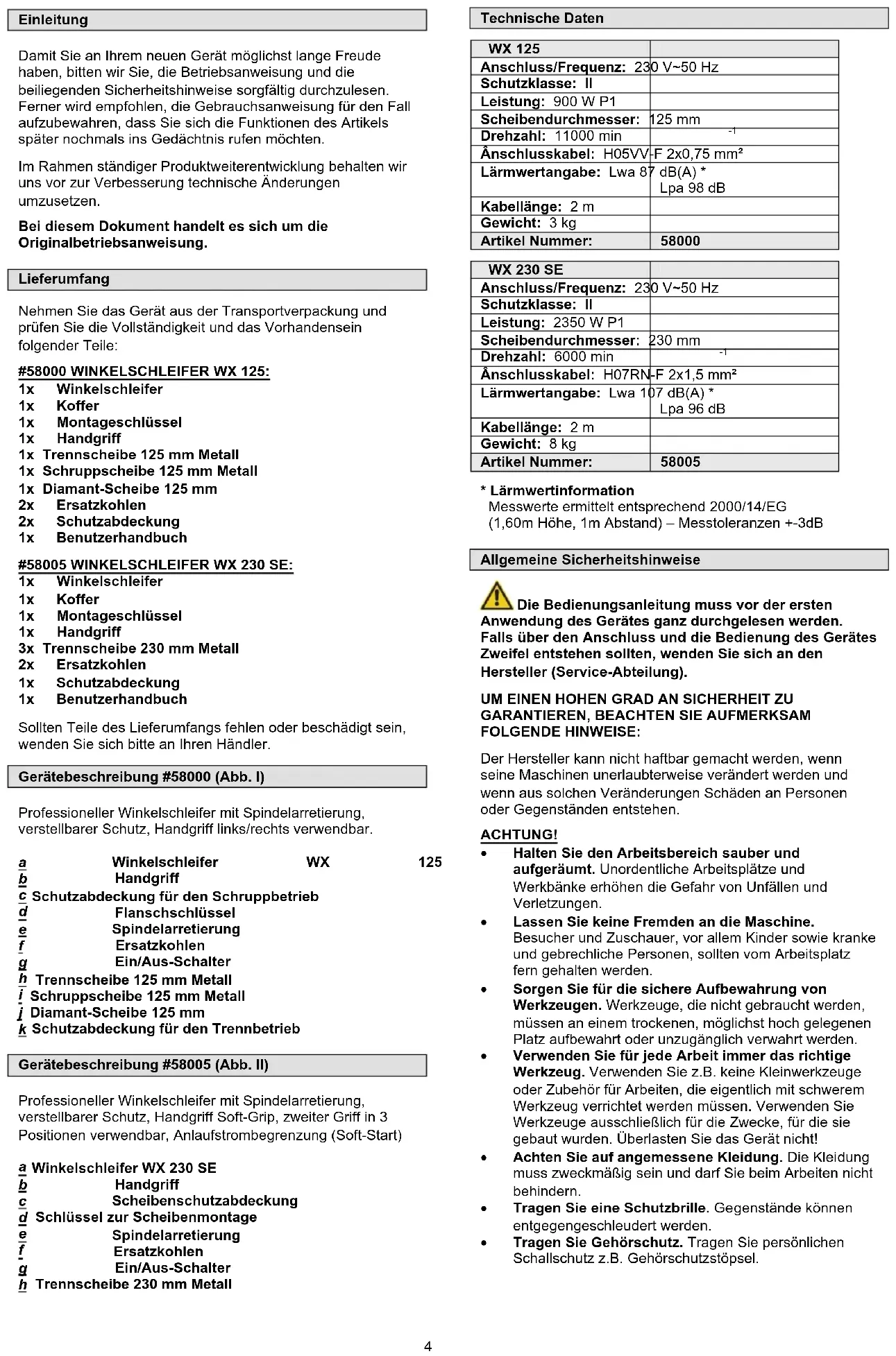 VII 3Einleitung Damit Sie an Ihrem neuen Gerät möglichst lange Freude haben, bitten wir Sie, die Betriebsanweisung und die beiliegenden Sicherheitshinweise sorgfältig durchzulesen. Ferner wird empfohlen, die Gebrauchsanweisung für den Fall aufzubewahren, dass Sie sich die Funktionen des Artikels später nochmals ins Gedächtnis rufen möchten. Im Rahmen ständiger Produktweiterentwicklung behalten wir uns vor zur Verbesserung technische Änderungen umzusetzen. Bei diesem Dokument handelt es sich um die Originalbetriebsanweisung. Lieferumfang Nehmen Sie das Gerät aus der Transportverpackung und prüfen Sie die Vollständigkeit und das Vorhandensein folgender Teile: #58000 WINKELSCHLEIFER WX 125: 1x Winkelschleifer 1x Koffer 1x Montageschlüssel 1x Handgriff 1x Trennscheibe 125 mm Metall 1x Schruppscheibe 125 mm Metall 1x Diamant-Scheibe 125 mm 2x Ersatzkohlen 2x Schutzabdeckung 1x Benu tzerhandbuch #58005 WINKELSCHLEIFER WX 230 SE: 1x Winkelschleifer 1x Koffer 1x Montageschlüssel 1x Handgriff 3x Trennscheibe 230 mm Metall 2x Ersatzkohlen 1x Schutzabdeckung 1x Benu tzerhandbuch Sollten Teile des Lieferumfangs fehlen oder beschädigt sein, wenden Sie sich bitte an Ihren Händler. Gerätebeschreibung #58000 (Abb. I) Professioneller Winkelschleifer mit Spindelarretierung, verstellbarer Schutz, Handgriff links/rechts verwendbar.