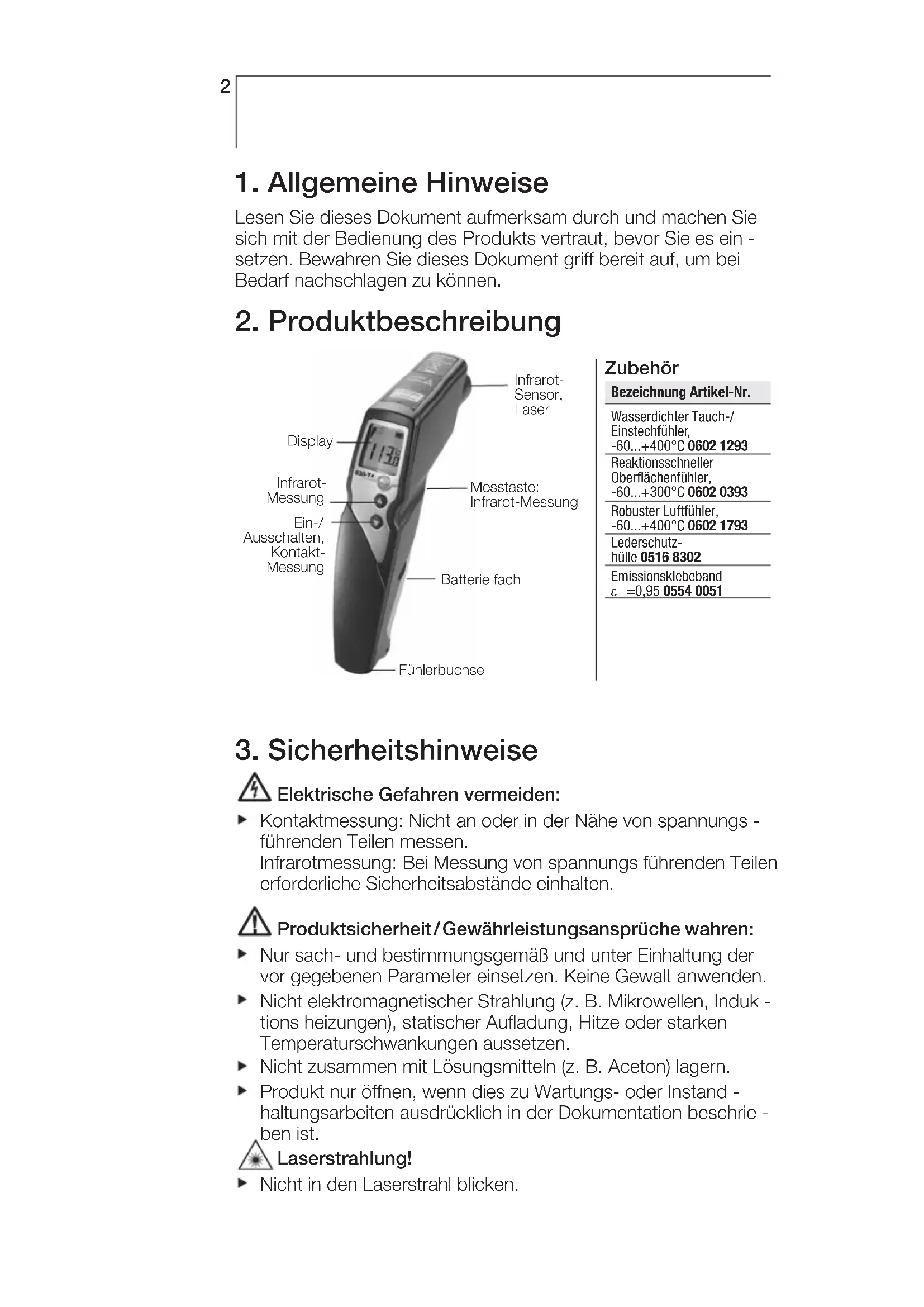 Elektrische Gefahren vermeiden: Kontaktmessung: Nicht an oder in der Nähe von spannungs - führenden Teilen messen. Infrarotmessung: Bei Messung von spannungs führenden Teilen erforderliche Sicherheitsabstände einhalten. Produktsicherheit / Gewährleistungsansprüche wahren: Nur sach- und bestimmungsgemäß und unter Einhaltung der vor gegebenen Parameter einsetzen. Keine Gewalt anwenden. Nicht elektromagnetischer Strahlung (z. B. Mikrowellen, Induk - tions heizungen), statischer Aufladung, Hitze oder starken Temperaturschwankungen aussetzen. Nicht zusammen mit Lösungsmitteln (z. B. Aceton) lagern. Produkt nur öffnen, wenn dies zu Wartungs- oder Instand - haltungsarbeiten ausdrücklich in der Dokumentation beschrie - ben ist. Laserstrahlung! Nicht in den Laserstrahl blicken. Infrarot- Sensor, Laser Batterie fach Display Ein-/ Ausschalten, Kontakt- Messung Messtaste: Infrarot-Messung Infrarot- Messung Fühlerbuchse Zubehör Bezeichnung Artikel-Nr. Wasserdichter Tauch-/ Einstechfühler